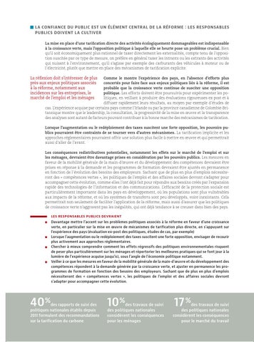 La confiance du public est un élément central de la réforme : les responsables publics doivent la cultiver La mise en place d’une tarification directe des activités écologiquement dommageables est indispensable à la croissance verte, mais l’opposition politique à laquelle elle se heurte pose un problème crucial. Bien qu’il soit économiquement plus rationnel de taxer directement les externalités, compte tenu de l’opposition suscitée par ce type de mesure, on préfère en général taxer les intrants ou les extrants des activités qui nuisent à l’environnement, qu’il s’agisse par exemple des carburants des véhicules à moteur ou de l’électricité, plutôt que mettre en place des mécanismes de tarification explicite.