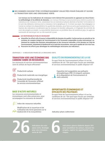 Des données doivent être systématiquement collectées pour évaluer et suivre la transition vers une croissance verte Les travaux sur les indicateurs de croissance verte doivent être poursuivis en agissant sur deux fronts : la méthodologie et les déficits de données. Les travaux théorique se poursuivent pour mettre au point les indicateurs de croissance verte, notamment les six indicateurs phares destinés à faciliter l’articulation et le suivi des éléments centraux de la croissance verte (graphique 2). Il revient aux pays d’accompagner ce travail en veillant à la disponibilité et la qualité des données, pour faire en sorte que la production et l’utilisation des indicateurs ne pâtissent pas du manque de données adéquates, et d’appuyer les activités de suivi des progrès accomplis. La mesurabilité demeurant un problème dans de nombreux pays, les agences nationales de statistique ont un rôle essentiel à jouer. Les responsables publics devraient