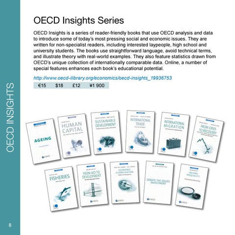 OECD Insights Series OECD Insights is a series of reader-friendly books that use OECD analysis and data to introduce some of today’s most pressing social and economic issues. They are written for non-specialist readers, including interested laypeople, high school and university students. The books use straightforward language, avoid technical terms, and illustrate theory with real-world examples. They also feature statistics drawn from OECD’s unique collection of internationally comparable data. Online, a number of special features enhances each book’s educational potential.