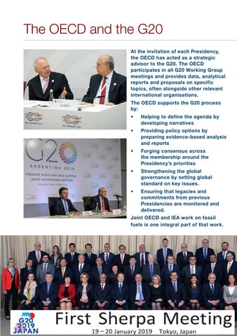 The OECD and the G20 At the invitation of each Presidency, the OECD has acted as a strategic advisor to the G20. The OECD participates in all G20 Working Group meetings and provides data, analytical reports and proposals on specific topics, often alongside other relevant international organisations. The OECD supports the G20 process by: •