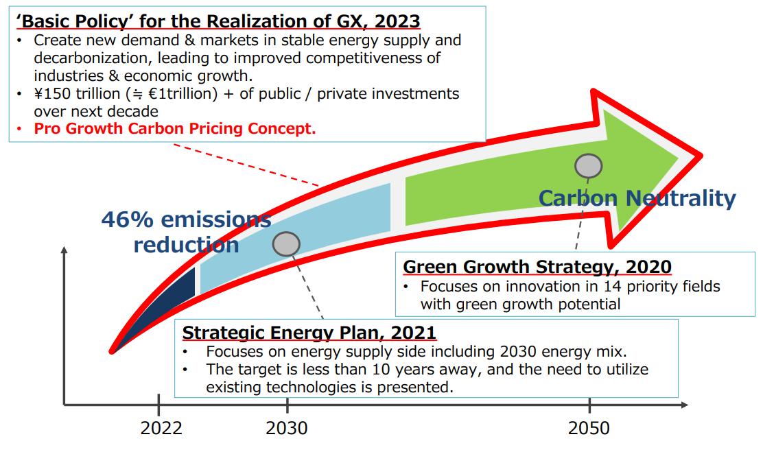 Third, the Basic Policy for the Realisation of the Green Transition (GX) (2023) provides the overall framework and direction for the green transition in Japan, and the implementation programme “GX Promotion Strategy”, which foresees, among other policies, issuing green transformation bonds [approx. USD 140 billion (JPY 20 trillion)] in 2023 to support investments in non-fossil energy technologies that are still in development, such as carbon capture, use and storage (CCUS) or hydrogen, as well as a carbon pricing