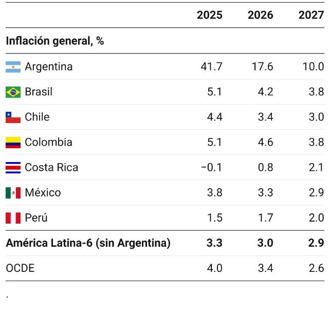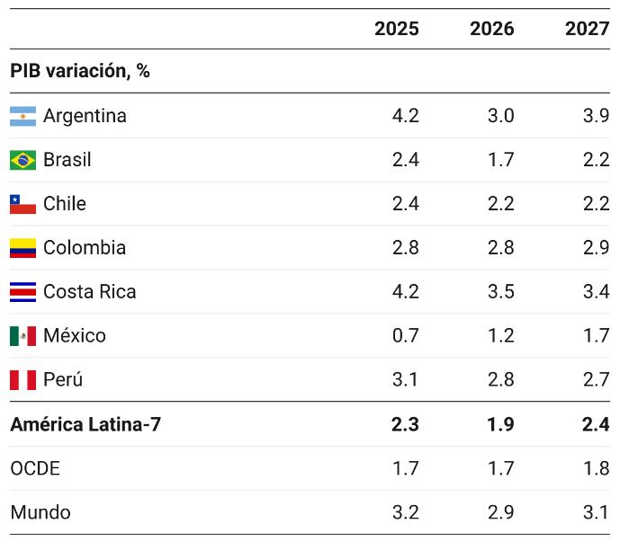 Nota: América Latina 7 es la media ponderada por el PIB a valores de paridad del poder de compra de los 7 países en la tabla para el PIB. América Latina 6 es la media simple de los países incluidos en el cuadro para la inflación excluyendo a Argentina Fuente: OCDE Perspectivas Económicas No. 118, diciembre de 2025.