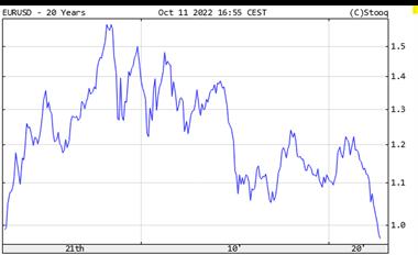 Fonte: Stooq Legenda: O gráfico acima ilustra a evolução do camnio EUR/USD, num período de 20 anos. Objetivo principal, ilustrar a baixa de 20 anos de EUR/USD, abaixo do nível de paridade.