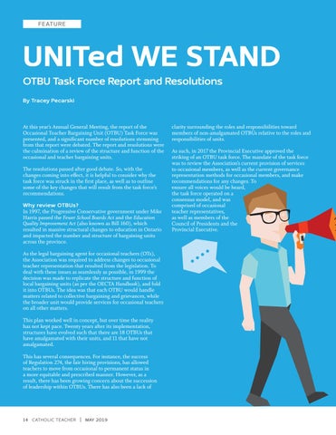 clarity surrounding the roles and responsibilities toward members of non-amalgamated OTBUs relative to the roles and responsibilities of units. As such, in 2017 the Provincial Executive approved the striking of an OTBU task force. The mandate of the task force was to review the Association’s current provision of services to occasional members, as well as the current governance representation methods for occasional members, and make recommendations for any changes. To ensure all voices would be heard, the task force operated on a consensus model, and was comprised of occasional teacher representatives, as well as members of the Council of Presidents and the Provincial Executive.