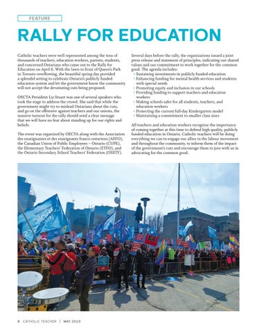 Several days before the rally, the organizations issued a joint press release and statement of principles, indicating our shared values and our commitment to work together for the common good. The agenda includes: • Sustaining investments in publicly funded education • Enhancing funding for mental health services and students with special needs • Promoting equity and inclusion in our schools • Providing funding to support teachers and education workers • Making schools safer for all students, teachers, and education workers • Protecting the current full-day Kindergarten model • Maintaining a commitment to smaller class sizes All teachers and education workers recognize the importance of coming together at this time to defend high quality, publicly funded education in Ontario. Catholic teachers will be doing everything we can to engage our allies in the labour movement and throughout the community, to inform them of the impact of the government’s cuts and encourage them to join with us in advocating for the common good.