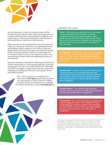 LEARNING THE LINGO into the classroom. A series of everyday scenarios will be presented in print and web video, which encourage viewers to consider and discuss their understanding of transphobic and sexual violence, while also providing them with information with which they can intervene in such instances. These scenarios are then integrated into four lesson plans for Grade 9-11 classrooms, which focus on promoting discussion and building students’ capacity to act as allies to trans and gender diverse students in the school and community at large. Finally, the project includes a half-hour documentary film for educators, which focuses on the experiences of five trans women living in Ontario while also explaining the basics of trans identity. Passionate educators committed to reflecting the full diversity of their communities in a nurturing and supportive classroom environment are at the core of safer schools work. Both Egale and OECTA are happy to support these educators, and anyone interested in creating safer schools for trans, gender diverse and LGBTQ students.