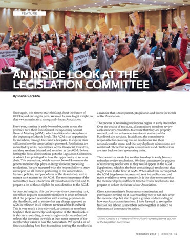a manner that is transparent, progressive, and meets the needs of the Association. The process of reviewing resolutions begins in early December. Over the course of two days, all committee members review each and every resolution, to ensure that they are properly worded, and that references to relevant sections of the Handbook are accurate. In addition, the committee is responsible for ensuring that all resolutions and their rationales make sense, and that any duplicate submissions are combined. Those that require amendments and clarifications are sent back to their sponsoring units. The committee meets for another two days in early January, to further review resolutions. We then commence the process of numbering resolutions as they would appear in the AGM Supplement, which is the book containing all resolutions that might come to the floor at AGM. When all of this is completed, the AGM Supplement is prepared, sent for publication, and made available to every member. It is our duty to ensure that the membership has sufficient time to review resolutions and prepare to debate the future of our Association. Given the committee’s focus on our constitution and governance, serving on it is a rewarding way to not only serve the membership, but also to gain a greater understanding of how our Association functions. I look forward to seeing the fruits of our labour, as members come together in March to demonstrate democracy in action. Dianna Corazza is a member of York Unit and currently serves as Chair of the Legislation Committee.