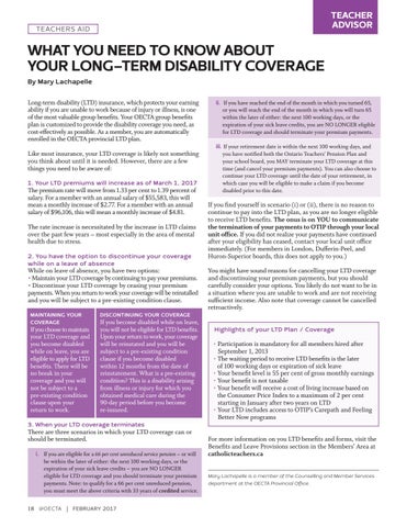 • Participation is mandatory for all members hired after September 1, 2013 • The waiting period to receive LTD benefits is the later of 100 working days or expiration of sick leave • Your benefit level is 55 per cent of gross monthly earnings • Your benefit is not taxable • Your benefit will receive a cost of living increase based on the Consumer Price Index to a maximum of 2 per cent starting in January after two years on LTD • Your LTD includes access to OTIP’s Carepath and Feeling Better Now programs For more information on you LTD benefits and forms, visit the Benefits and Leave Provisions section in the Members’ Area at catholicteachers.ca Mary Lachapelle is a member of the Counselling and Member Services department at the OECTA Provincial Office.
