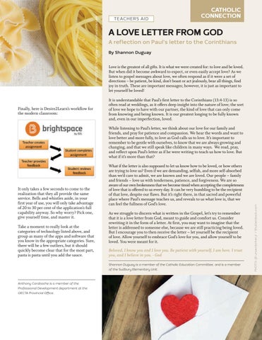 What if the letter is also supposed to let us know how to be loved, or how others are trying to love us? Even if we are demanding, selfish, and more self-absorbed than we’d care to admit, we are known and we are loved. Our people – family and friends – love us with tenderness, patience, and forgiveness. We are so aware of our own brokenness that we become timid when accepting the completeness of love that is offered to us every day. It can be very humbling to be the recipient of that love, despite our flaws. But it’s right there, in that sacred and powerful place where Paul’s message teaches us, and reveals to us what love is, that we can feel the fullness of God’s love. As we struggle to discern what is written in the Gospel, let’s try to remember that it is a love letter from God, meant to guide and comfort us. Consider rewriting it in the form of a letter. At first, you may want to imagine that the letter is addressed to someone else, because we are still practicing being loved. But I encourage you to then receive the letter – let yourself be the recipient of love. Allow yourself to embrace God’s love for you, and allow yourself to be loved. You were meant for it. Beloved, I know you and I love you. Be patient with yourself, I am here. I trust you, and I believe in you. - God Shannon Duguay is a member of the Catholic Education Committee, and is a member of the Sudbury Elementary Unit.