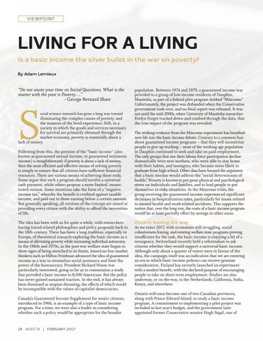 LIVING FOR A LIVING Is a basic income the silver bullet in the war on poverty? By Adam Lemieux