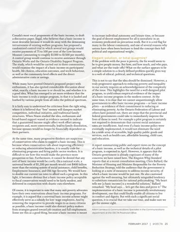 Canada’s most vocal proponents of the basic income, to draft a discussion paper. Segal, who believes that a basic income is most desirable because it would do away with the demeaning intrusiveness of existing welfare programs, has proposed a randomized control trial in which several test groups would receive payments of 75 to 100 per cent of the Low-Income Measure (amounting to roughly $1300 to $1500 per month). A control group would continue to receive assistance through Ontario Works and the Ontario Disability Support Program. The study, which would be carried out in three communities, would examine the impact of a basic income on participants’ health, life choices, education outcomes, and work behaviour, as well as the community-level effects and the direct administrative costs or savings.