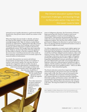 issues in Indigenous education, the Government of Ontario began partnering with Teach for Canada to send recent university graduates to teach in rural and indigenous communities. Unfortunately, this partnership does little to redress the serious education and resource gaps faced by Indigenous students. Not only does this transfer a public government’s obligation for education to a private entity, but it does so by placing relatively inexperienced teachers in some of the province’s highest-need areas. As a labour organization, we must remain vigilant against any pretense toward privatization in the education sector. Faced with public debt and budgetary constraints, governments from around the world have adopted austerity measures, often at the expense of unions. Many of these measures have significantly cut funding to education, and also have sought to deregulate teaching by attacking education workers’ rights to collective bargaining. Individualized contracts, performance-related pay, and a diluted talent pool make it increasingly difficult to negotiate collectively, undermining the fundamental right to organize. And the tendency for private education providers to employ lower-paid, lower-qualified workers – often in an effort to cut costs – hurts educational quality. The Ontario education system faces important challenges, and leaving things to the private sector may seem like the easier route to take. But what is easy isn’t necessarily what is right. Ultimately, the movement toward privatization and commercialization in education promotes inequalities, diminishes quality, and threatens unions. And while the encroachment of privatization into education may seem less dramatic than a Michael Moore documentary, the end-game is the same. The long-term health of our system hangs in the balance.