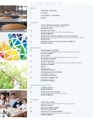 12 SUPPORTING GENDER DIVERSITY IN THE CLASSROOM Partnership between Egale and OECTA provides tools for safer schools By Alyx Duffy 15