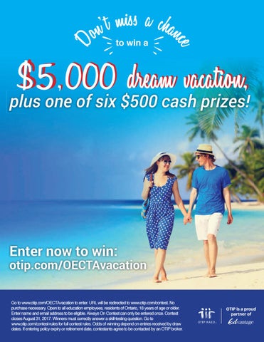 otip.com/OECTAvacation Go to www.otip.com/OECTAvacation to enter. URL will be redirected to www.otip.com/contest. No purchase necessary. Open to all education employees, residents of Ontario, 18 years of age or older. Enter name and email address to be eligible. Always On Contest can only be entered once. Contest closes August 31, 2017. Winners must correctly answer a skill-testing question. Go to www.otip.com/contest-rules for full contest rules. Odds of winning depend on entries received by draw dates. If entering policy expiry or retirement date, contestants agree to be contacted by an OTIP broker.