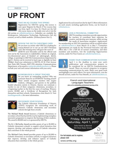 April 1 is the deadline to enter your unit’s publications and communication projects to be considered for an OECTA Communications Award. There are several categories to recognize outstanding communications by units. Share your good work and highlight your unit’s efforts. For more information, visit the Awards section, under For Your Benefit, at catholicteachers.ca. French and International Languages Teachers: Join us for outstanding professional learning at the