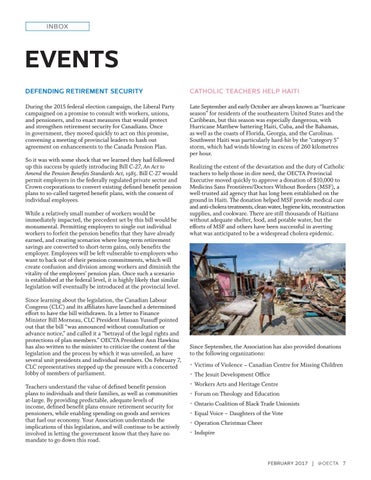 So it was with some shock that we learned they had followed up this success by quietly introducing Bill C-27, An Act to Amend the Pension Benefits Standards Act, 1985. Bill C-27 would permit employers in the federally regulated private sector and Crown corporations to convert existing defined benefit pension plans to so-called targeted benefit plans, with the consent of individual employees. While a relatively small number of workers would be immediately impacted, the precedent set by this bill would be monumental. Permitting employers to single out individual workers to forfeit the pension benefits that they have already earned, and creating scenarios where long-term retirement savings are converted to short-term gains, only benefits the employer. Employees will be left vulnerable to employers who want to back out of their pension commitments, which will create confusion and division among workers and diminish the vitality of the employees’ pension plan. Once such a scenario is established at the federal level, it is highly likely that similar legislation will eventually be introduced at the provincial level. Since learning about the legislation, the Canadian Labour Congress (CLC) and its affiliates have launched a determined effort to have the bill withdrawn. In a letter to Finance Minister Bill Morneau, CLC President Hassan Yussuff pointed out that the bill “was announced without consultation or advance notice,” and called it a “betrayal of the legal rights and protections of plan members.” OECTA President Ann Hawkins has also written to the minister to criticize the content of the legislation and the process by which it was unveiled, as have several unit presidents and individual members. On February 7, CLC representatives stepped up the pressure with a concerted lobby of members of parliament. Teachers understand the value of defined benefit pension plans to individuals and their families, as well as communities at-large. By providing predictable, adequate levels of income, defined benefit plans ensure retirement security for pensioners, while enabling spending on goods and services that fuel our economy. Your Association understands the implications of this legislation, and will continue to be actively involved in letting the government know that they have no mandate to go down this road.