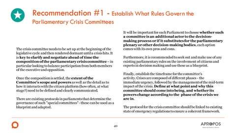 Recommendation #1 - Establish What Rules Govern the Parliamentary Crisis Committees It will be important for each Parliament to choose whether such a committee is an additional actor to the decisionmaking process or if it substitutes for the parliamentary plenary or other decision-making bodies, each option comes with its own pros and cons.