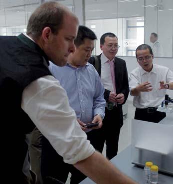 – At exactly 10 a.m., the doors of OELCHECK China Ltd. swung open in the first of the two 38-storey of fi ce towers of the Tian An Hi-Tech Ecological Park. The first of more than 150 guests had already arrived to join us in celebrating the of fi cial opening of the new OELCHECK laboratory in China. After being welcomed by the entire management team of OELCHECK, the guests could hardly contain their astonishment. The laboratory and associated of fi ces occupy an impressive 550 square metres on the third fl oor of the tower. In the past few months, the premises had been fi tted out with water and electricity installations, special air conditioning and oil-resistant fl oors. After thorough preparation and many test runs, some conducted together with the Chinese laboratory staff, all the equipment for the laboratory had been fl own in from Germany. The OELCHECK laboratory presented to our guests in Guangzhou is virtually identical to the one in Brannenburg. Customers can also draw on the experience of the engineers in Germany, since the data acquired in China is transferred to the German system over a secure data link and interpreted there right away by the German engineers. During a guided tour, the test equipment was presented and the guests were told how the data is obtained from the oil. The three-hour seminar programme, in which our specialists talked about modern lubricants and the many different analysis methods, met with great interest. The talks triggered discussions that extended past the end of the main programme and were continued almost with out pause during the typical Bavarian buffet.