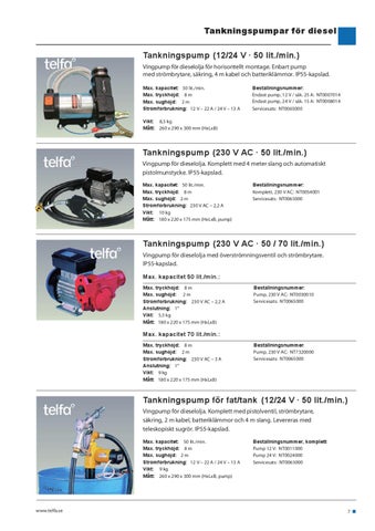 Tankningspump (230 V AC · 50 / 70 lit./min.) Vingpump för dieselolja med överströmningsventil och strömbrytare. IP55-kapslad. Max. kapacitet 50 lit./min.: Max. tryckhöjd: 8 m Max. sughöjd: 2 m Strömförbrukning: 230 V AC – 2,2 A Anslutning: 1" Vikt: 5,5 kg Mått: 180 x 220 x 175 mm (HxLxB)