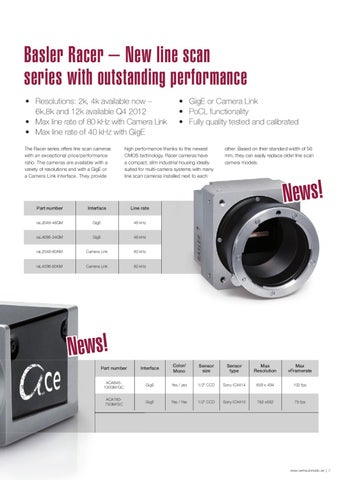 Basler Racer – New line scan series with outstanding performance • Resolutions: 2k, 4k available now – 6k,8k and 12k available Q4 2012 • Max line rate of 80 kHz with Camera Link • Max line rate of 40 kHz with GigE The Racer series offers line scan cameras with an exceptional price/performance ratio. The cameras are available with a variety of resolutions and with a GigE or a Camera Link interface. They provide
