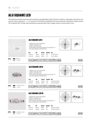 alu square LED I » Valaisimen teho: 3,6W ± 5% (350mA) » Valaisimen valomÀÀrÀ: 150 lm » ElinikÀ: (L70) 30 000 tuntia » KÀytÀ suojakupua asennettaessa eristeisiin. Katso taulukko s. 111 » Min. asennustila (pxlxk): 200x200x50 mm