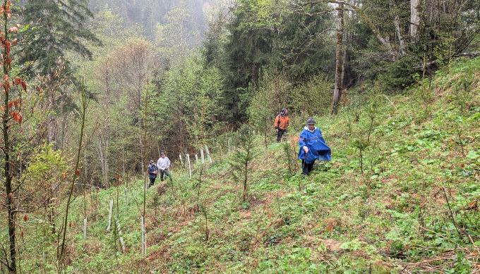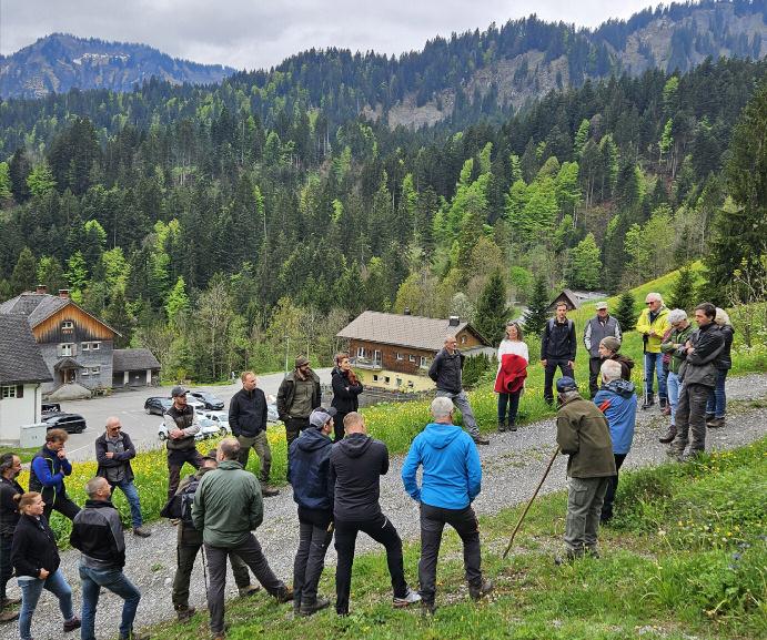 Über Einladung und Initiative von Fabian Simon, Jagdleiter der Genossenschaftsjagd Ebnit, fand am 8. Mai nachmittags eine Begehung der Schutzwälder direkt oberhalb des Dornbirner Bergdorfes statt. Ebnit ist auf Grund seiner exponierten Lage naturgemäß von Steinschlägen, Lawinen, Hangrutschungen und Wildbächen bedroht. Deshalb haben die Wälder oberhalb des Dorfes neben der Wohlfahrtsfunktion, Erholungsfunktion und Wirtschaftsfunktion vor allem eine besondere Schutzfunktion. Durch frühere Waldweide, eine vernachlässigte Forstwirtschaft und vor allem durch die jahrzehntelange Baumselektion durch viel zu hohe Schalenwildbestände, sind in der Vergangenheit überwiegend anfällige Fichtenwälder entstanden. Mehrere orkanartige Stürme in den 1980er und 1990er Jahren führten dann zu großflächigen Windwürfen und anschließenden Borkenkäferkalamitäten Dies machte in der Folge verstärkt technische Verbauungen und Schutzwaldsanierungen notwendig Von der Wildbach- und Lawinenverbauung
