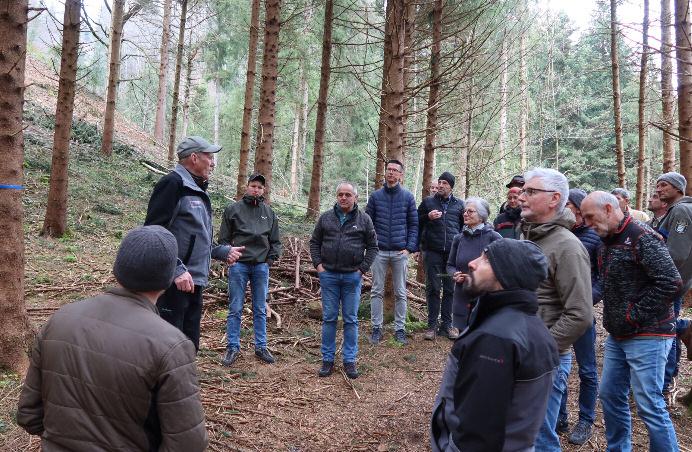 Fabian Simon berichtete, dass bereits vor Jahren die Rot- und Rehwildfütterung eingestellt wurde. Auch dies hat sich sehr positiv ausgewirkt Es konnte kein Fallwild festgestellt werden und die Abschusszahlen und Wildbrettgewichte blieben gleichbleibend. Die Verbissschäden gingen auf ein sehr geringes Ausmaß zurück und es können sich nun erfolgreich alle heimischen Mischbaumarten natürlich verjüngen Das Äsungangebot für die Wildtiere ist stark angestiegen. Allerdings wird die Jagd dadurch auch immer aufwendiger und erfordert permanenten Einsatz. Davon konnten sich die zahlreichen Exkursionsteilnehmer vor Ort überzeugen.