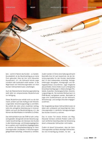 Zudem werden im Sinne einer Gattungsvollmacht Geschäfte ihrer Art nach bezeichnet, die der Versicherungsmakler für den Kunden abschließen darf. Er wird insbesondere ermächtigt, Vertragserklärungen abzugeben, Kündigungen und Vertragsabschlüsse vorzunehmen, sogar Vergleiche abzuschließen, ferner erhält er auch umfangreiche Einsichtsermächtigungen in Aktenunterlagen Protokolle, Gutachten, Krankengeschichten, Versicherungsverträge etc. Der konkrete Wortlaut kann im ÖVM-Muster nachgelesen werden. Beinhaltet ist sogar eine Zustellvollmacht und die Vollmacht, Versicherungs- und sonstige Urkunden entgegenzunehmen. Die Ausgestaltung dieses Vollmachtsformulars ist daher sehr umfassend und berechtigt den Versicherungsmakler in sämtliche Vertragsunterlagen des Kunden Einsicht zu nehmen. Das im ersten Teil dieses Artikels von Mag. Alexander Gimborn erörterte Problem sollte sich nach rechtlichen Gesichtspunkten bei Verwendung derart umfassender Vollmachten nicht stellen. Zudem ist darauf hinzuweisen, dass der Versicherungsmakler auf Basis derartiger Vollmachten, die eine Ermächtigung erhalten, für den ›› 04|2021