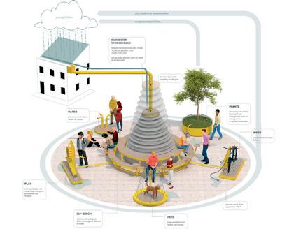 verticale, spiraalvormige waterzak beweegt mee met de hoeveelheid water die erin komt via afkoppeling van de regengoot. Een dynamisch en zichtbaar systeem dat uitnodigt tot interactie. Dankzij de hoogte ontstaat er voldoende druk om water te tappen, waarmee bijvoorbeeld planten kunnen worden bewaterd of kinderen kunnen spelen tijdens warme dagen. De ronde banken en tafels rondom de installatie maken het bovendien een sociale ontmoetingsplek waar natuur, mens en technologie elkaar vinden.