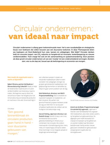 Circulair ondernemen is allang geen toekomstmuziek meer: het is een noodzakelijke en strategische keuze voor bedrijven die willen bouwen aan een duurzame toekomst. In deze Themaspecial delen zes koplopers uit Oost-Nederland hun visie, kansen én uitdagingen. Wat blijkt? Circulair denken leidt tot concrete impact: van CO2-reductie en hergebruik tot innovatie, kostenbesparing en nieuwe verdienmodellen. Toch vraagt het ook om lef, samenwerking en systeemverandering. Door pioniers als deze groeit circulair ondernemen uit van een ‘moetje’ tot een onderscheidend vermogen. Zij laten zien: wie nu de stap zet, bouwt aan de leefomgeving en economie van morgen. <