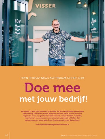 Kijk op Groot Amsterdam is een uitgave van: Brouwer Business Media BV, Het Voert 3B, 1613 KL Grootebroek, 0512-366326, www.kijkopnoord-holland.nl Redactie voor deze editie: Joost Dobbe, Marc Kok en anderen Aanleveren nieuwsberichten: nieuwsberichten@kijkopnoord-holland.nl Bladmanagement: Ed Klijnman Fotografie: Ed Klijnman. Advertentie-exploitatie en planning bedrijfsreportages: Piet Wiersma +31 6 53 42 42 78 pietwiersma@kijkopuitgevers.nl, Vormgeving: VDS Crossmedia, Emmen Druk en afwerking: Veldhuis Media, Meppel