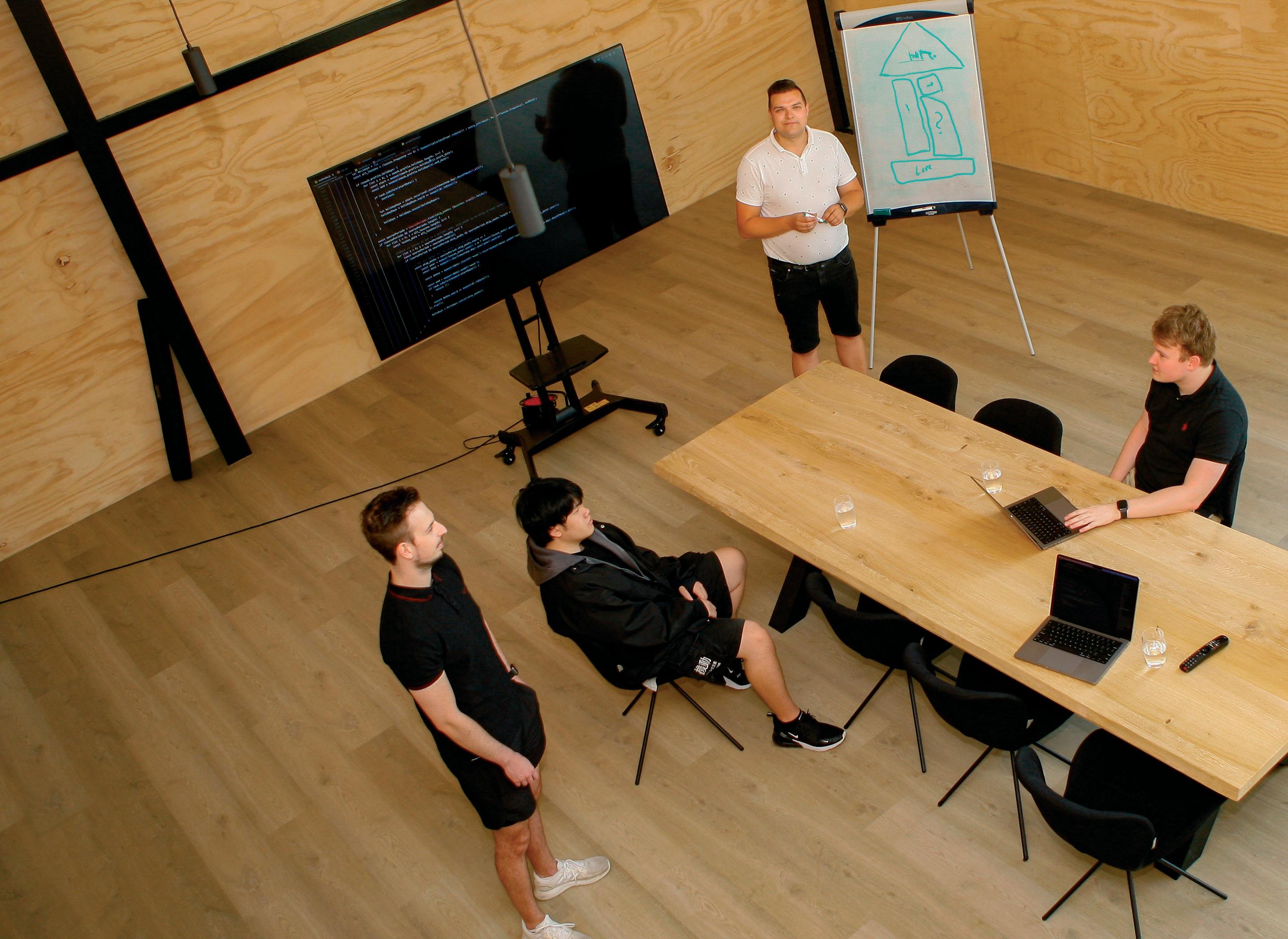 ICT-specialisten Eric Fransen en Theo Kerger en projectmanager Priscilla Dens voor het Softstream kantoor aan de Berglaan in Drachten.