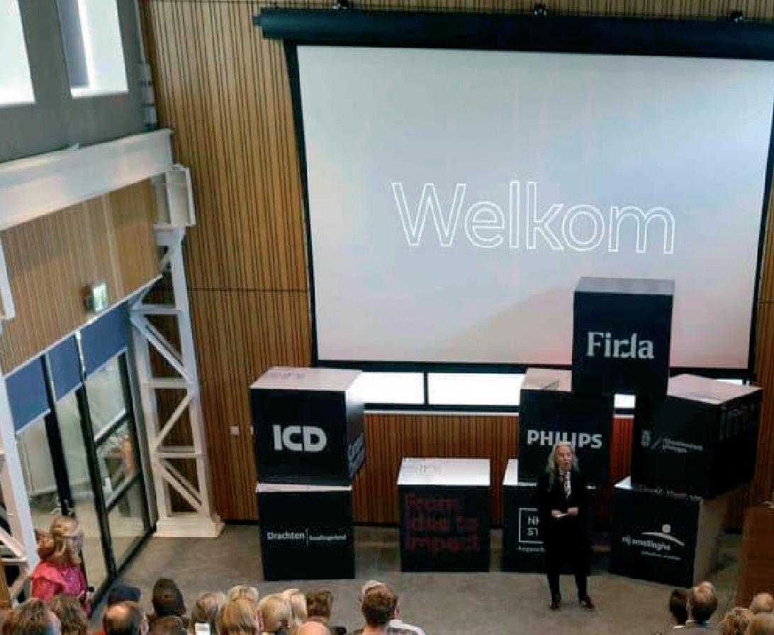 Met een inspirerend programma in het SKILL-gebouw bij Philips in Drachten is afgelopen vrijdag Campus Drachten officieel geopend. Bestuurders, studenten, onderzoekers en ondernemers kwamen samen om de start van deze unieke samenwerking te markeren én voor de presentatie van de krachtige nieuwe huisstijl van het merk. Er was een voelbare energie in de zaal: de urgentie is groot, de ambitie helder en de wil om er samen de schouders onder te zetten onmiskenbaar.