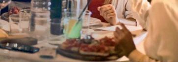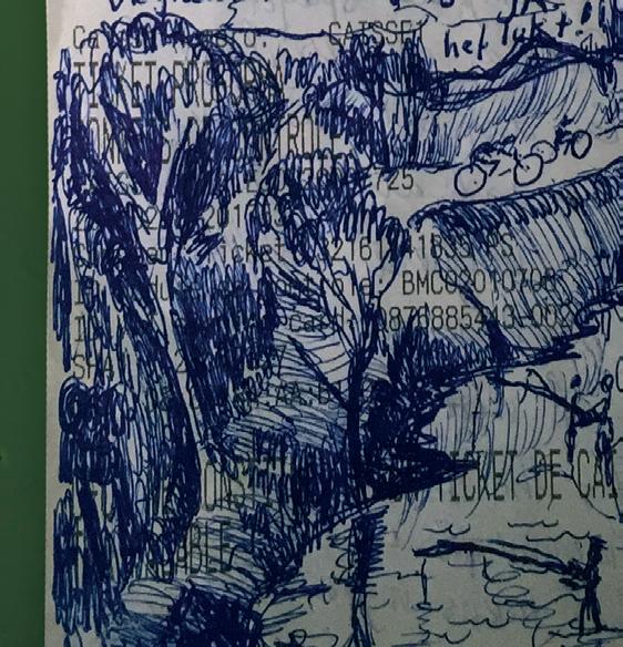 Bij het ontbijt vind ik in mijn broekzak dat bonnetje en ik krabbel wat bij de laatste koffie. Tekening en woorden komen rechtstreeks uit het onderbewuste; bergen, bomen, een riviertje met een visser, twee fietsers. En ineens merk ik dat die ene krabbel voor mij alles samenvat; sfeer, woorden, momentum.