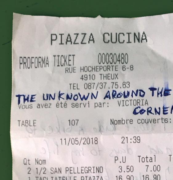 De avond voor de start eten we wat op een pleintje in Theux. Kasteel, riviertje; een marktplein met wat restaurants. Wijntje? Nou, eentje dan. Niet te gek; de atletische dag van morgen bepaalt ons menu. Kassabon mee voor de fiscus (je blijft ondernemer) en naar bed.