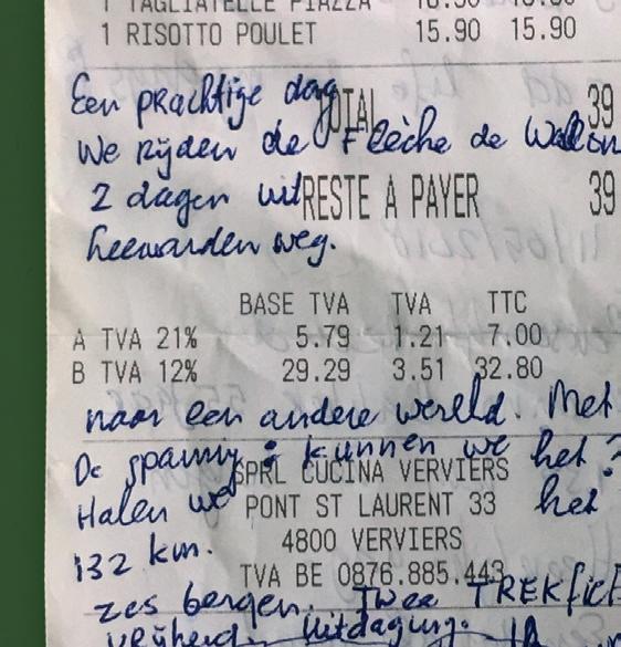 Terug naar de kassabon: het is mei 2018. Mijn zoon en ik houden van wielrennen en we hebben het plan om in juli de Croix de Fer te beklimmen. Maar eerst doen we iets dat we nog nooit hebben gedaan: we schrijven ons in voor een flinke kuitenbijter-tocht door de Ardennen. Daar doen dus honderden strak getrainde alfa-amateurs aan mee, met duizelingwekkende testosteron-niveaus en in de bloei van hun leven. Dat ik daar hooguit respect voor mijn leeftijd zal oogsten en meer ook niet is zo klaar als een klontje.