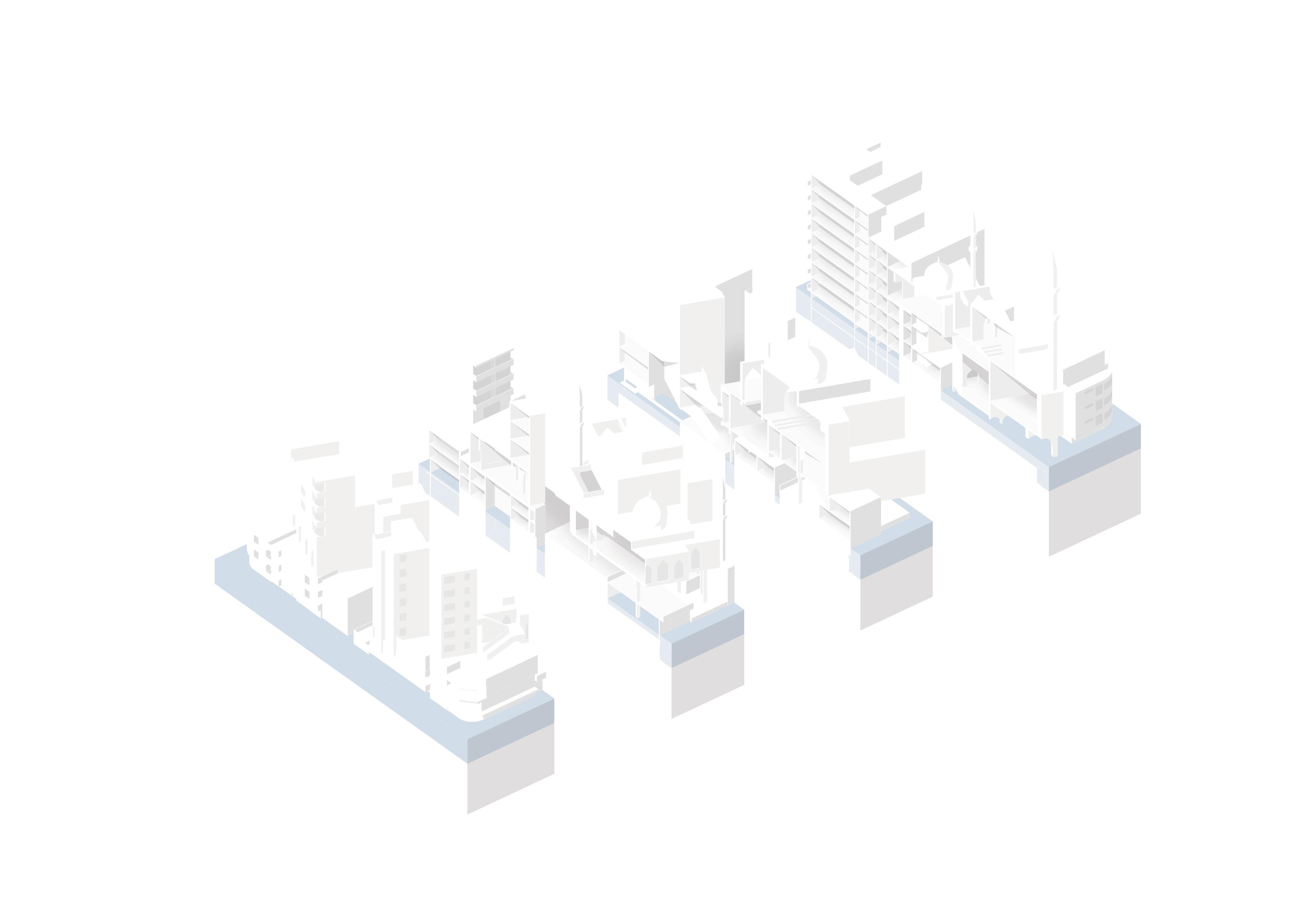 My architectural proposal to amplify mosque island is a staggering and positioning of the mosques on top of each other to ensure that each receive sufficient daylight and ventilation, as well as to create a series of wide walkways that connect the mosques to each other, and from Mosque island to other islands. The large cavernous mosque volumes are contrasted with smaller, fine-grained buildings that house the new population and provide the restaurants, cafes, and shops that typically support the large population on prayer days.