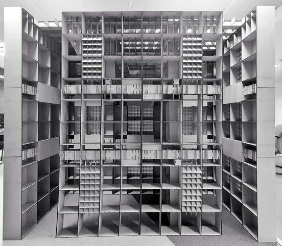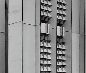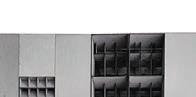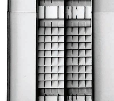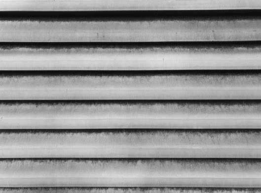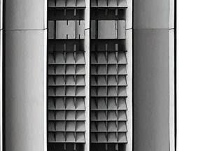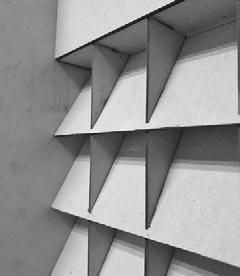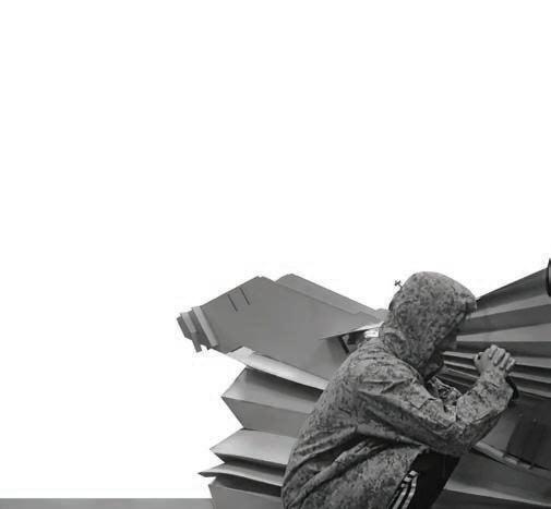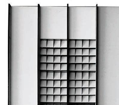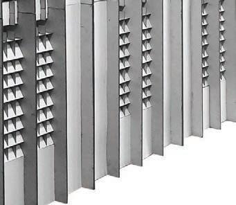 [Facing Page] Angled louvres screen off sight lines from intruding into the envelope. Together with the module-connecting pieces that look like miniature ducts,they tectonically add to the overall mechanical appearance of the envelope,further camouflaging it with the site.