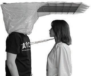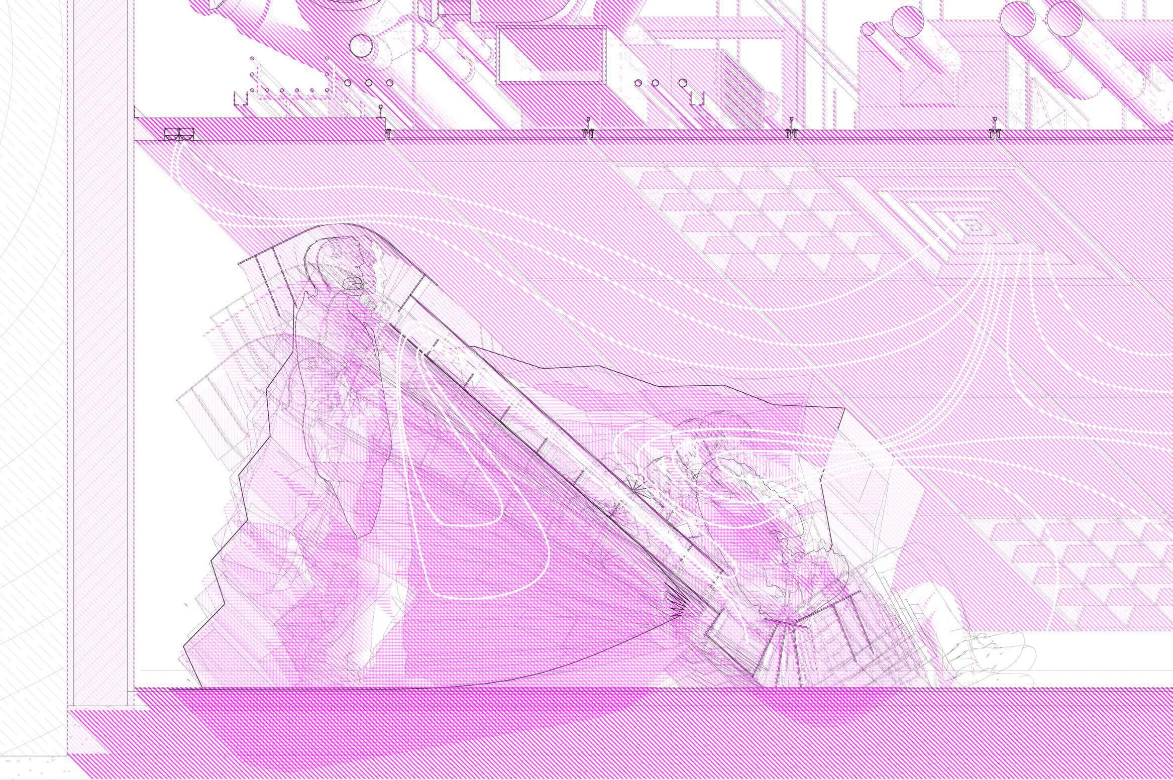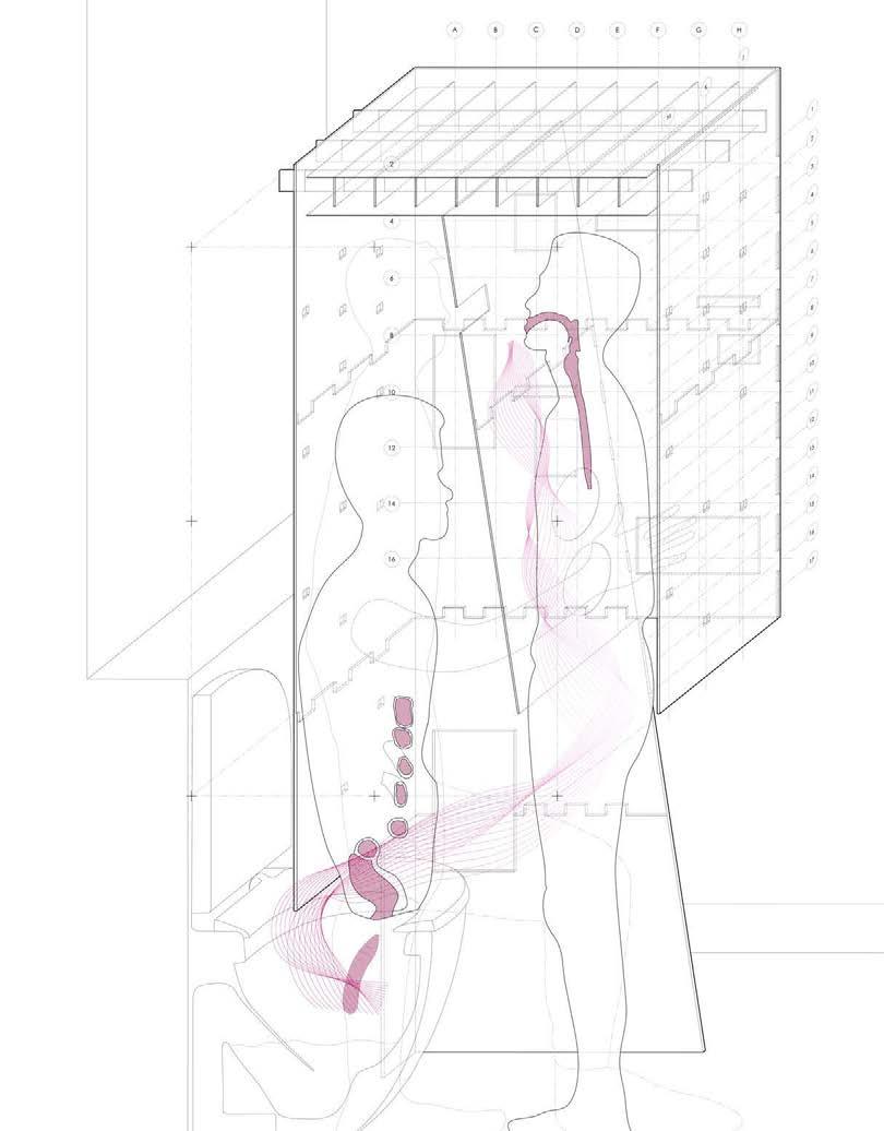 On the other hand, the one meant for theWorshipper has a three-tiered graduated environment within, depending on his displacement in the volume.The first tier, upon entering, is dark, perceptibly dirty and forces one to kneel in a confessional posture, metaphorically laying out one’s sins. An undulating sound tube connecting both spaces allows for the Priest and Worshipper to communicate from a distance. The second tier, metaphorically portraying the Holy Communion, is illuminated with a reddish glow and allows for the Priest to reach through the separating wall to safely comfort, anoint and bless theWorshipper physically through the material of latex. Both tiers are stuffy, warm, humid, and uncomfortable, strategies to limit the duration each visiting Worshipper spends inside. The third tier, metaphorically portraying the successful spiritual healing (‘raising’ ritual), requires the worshipper to stand, in which his head emerges into a well-lit and ventilated space, thrusting him back to thermal and climatic comfort.
