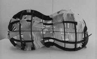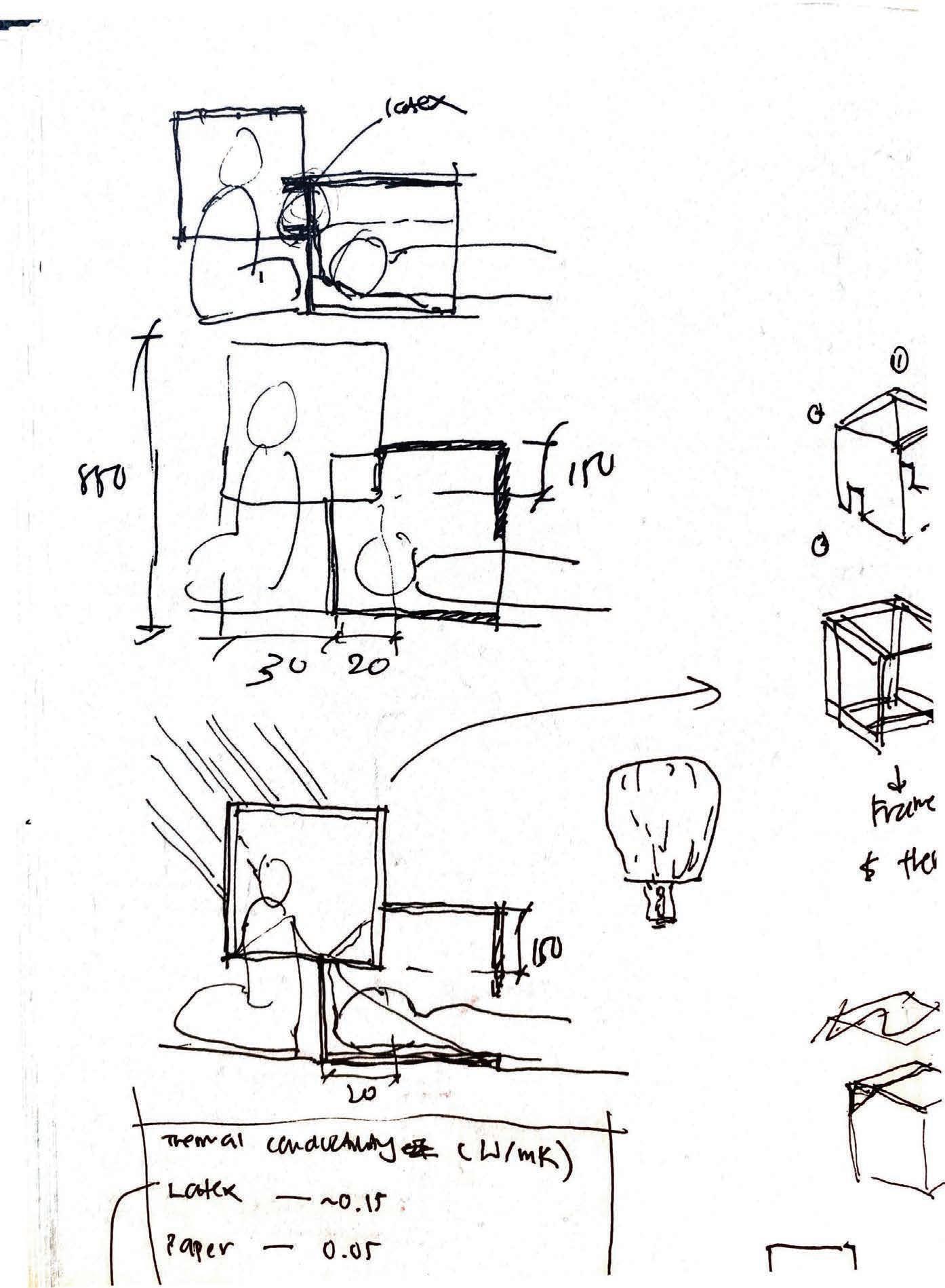 Previous iterations of the cool probe did not make accomodations for body contours, a consideration which is especially crucial since lying down puts one’s body in maximum contact with the ground or any surface. Retaining a double wall for insulation, the structural grid is re-layed to accomodate the weight of the body. Greyboard is also placed at angles to accomodate human contours.