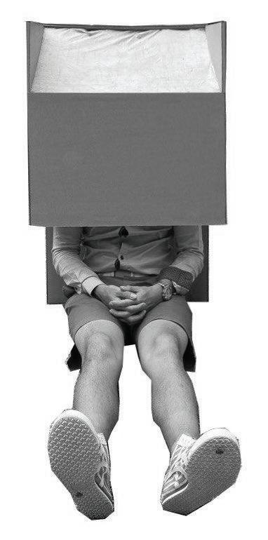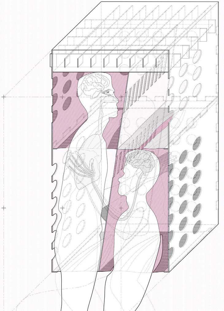 Despite these covert design strategies, the two discrete environments that have been carved out from the overall internal volume of the envelope provide for radically different experiences. The one meant for the Priest to reside in for the entire duration of the rituals provides for thermal and climatic comfort, where wind is channelled through and enhanced to naturally ventilate the space. The angled louvres also allow for a onesided view outward for the Priest’s personal surveillance, as well as act as perforations for natural light to illuminate through and dispel a sense of potential claustrophobia.