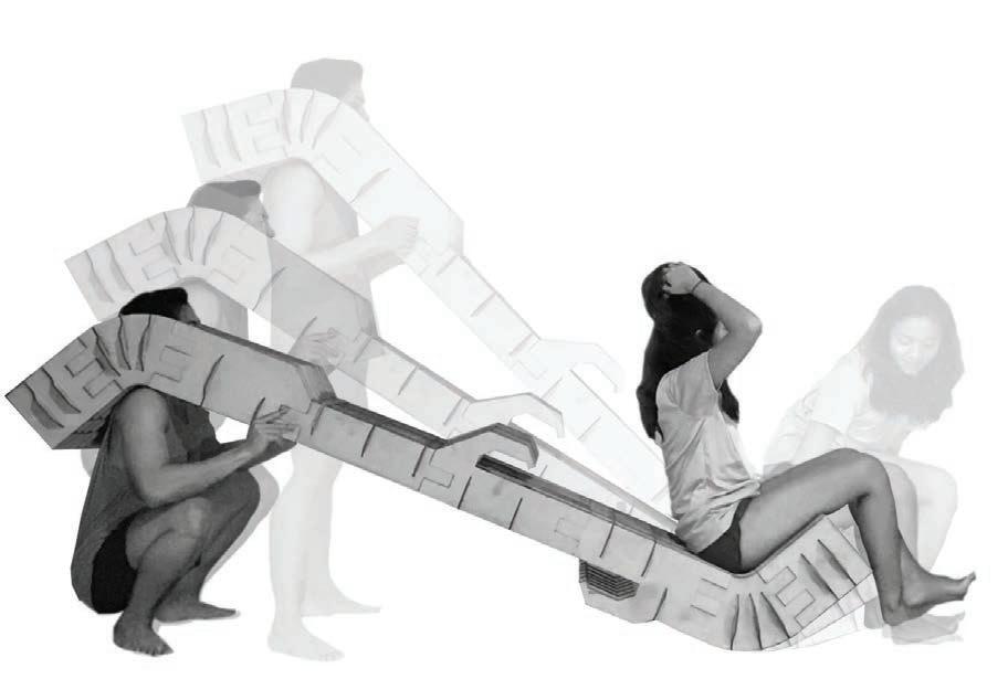 The platforms for the body to rest on unfold using latex as a joint. Handgrips and grooves to slot the structures are also made without disrupting the rectilinear form.