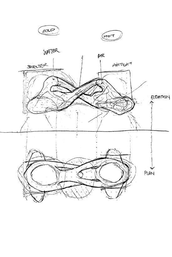 In line with the rising motion of hot air, the “ceiling” panel has been detached from the walls to give the impression of weightlessness at the top of the structure. e top half of the structure is technically quite weighty due to the double walled insulation, but this gesture conceals that.