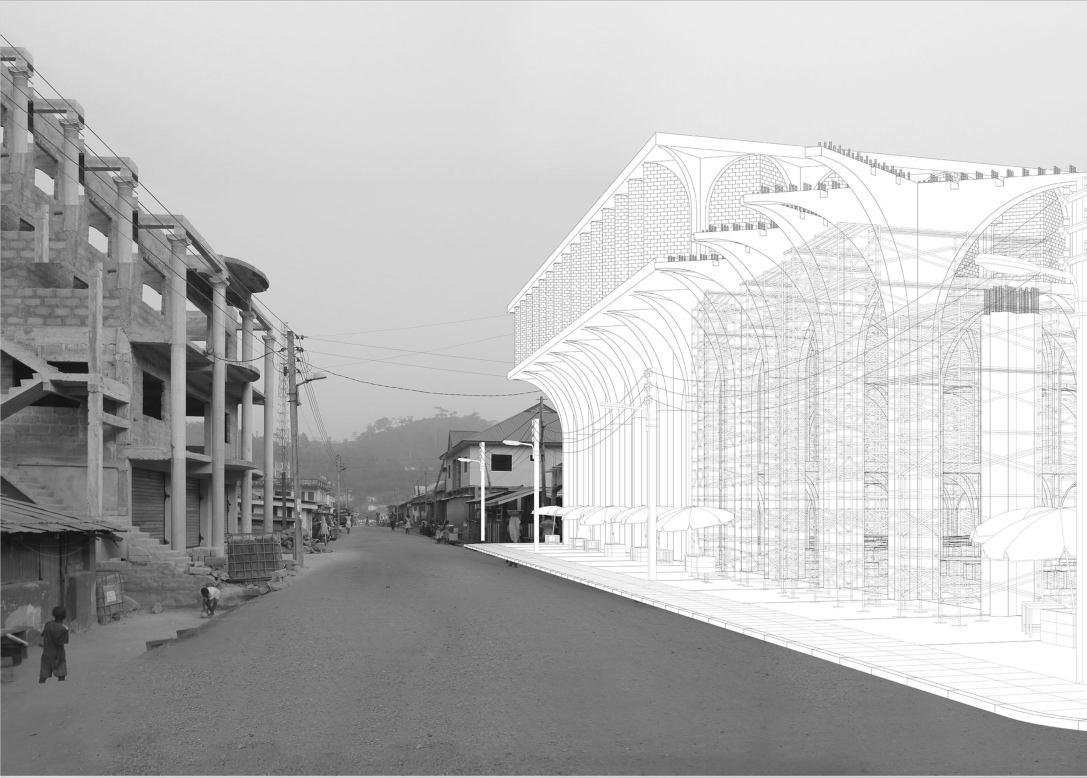 The proposed Gold House is shown incomplete to reflect the instability of state sponsored initiatives. It is also a representation of the boom or bust - should the town flourish and existing or new investments continue to fund construction, the building will be completed and the functions further legitimated. Should the town bust, the foundations of the ruin will serve as a plaza and market space that remains bustling with local activity.
