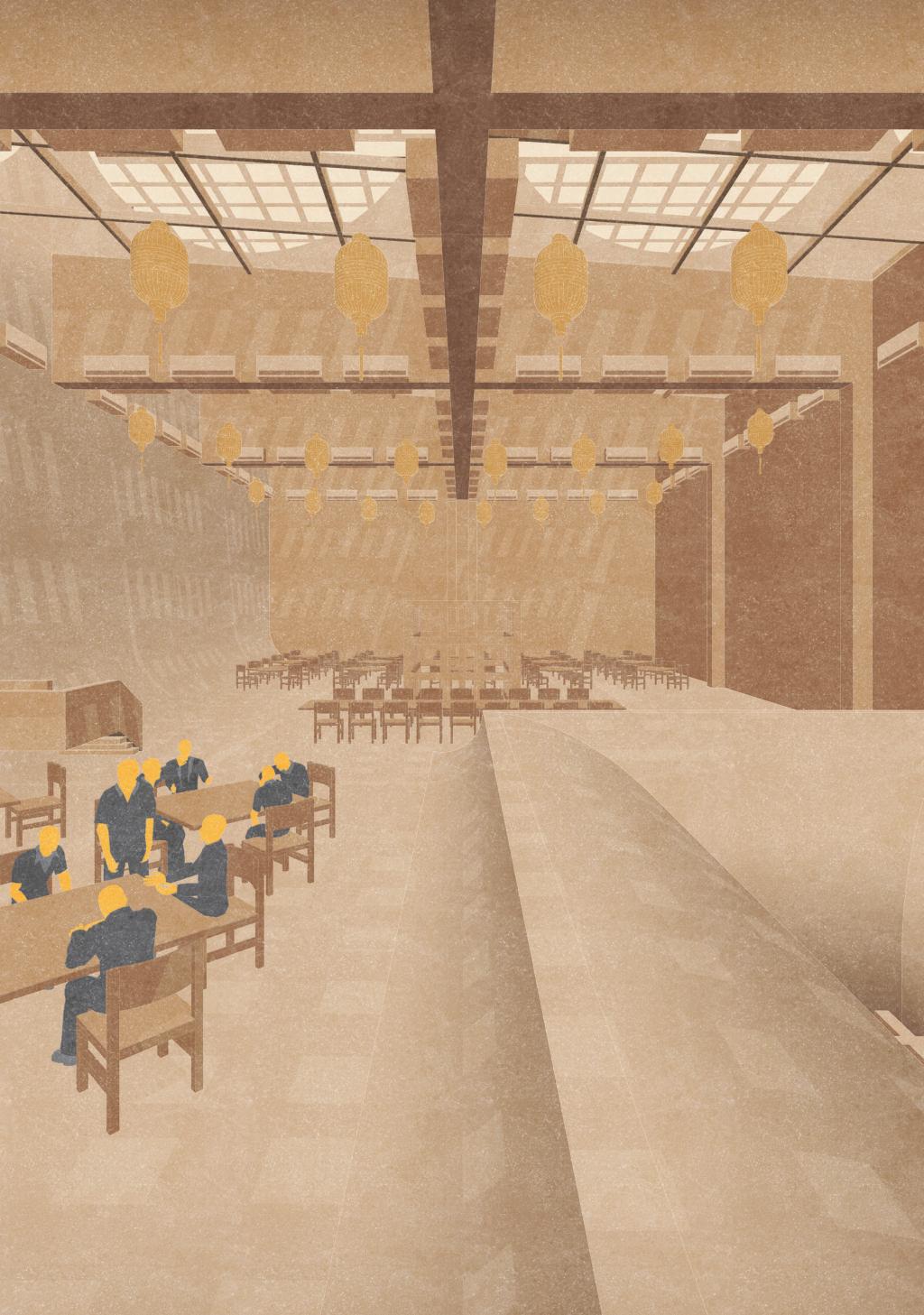 The politics of conditioned air drives the architecture. Through a series of leaky programs, the function of the building symbolises the power relations between Chinese immigrants and a rural Ghanaian community. Chinese restaurants and casinos leak conditioned air into the Ghanaian Gold Exchange and Gold Miners’ Union. The air above 1m is then leaked down into a public market before being pressurised through the chimney. The condensers face in towards shaft of the chimney, creating a negative pressure which exhausts all the air out of remaining openings.