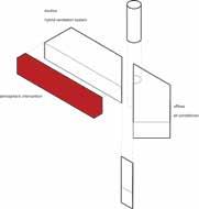 Firstly, the ventilation block façade on the west side is pushed away from the existing building in order to extend the buffer zone separating the outside from the noisesensitive studio spaces. To support the façade, a new web of steel columns and beams is attached to the façade on the west, which in turn are tied back to the existing beams and columns of the original building. These new columns are placed to the same rhythm as the existing ones to facilitate this. This functions as the first layer of noise mitigation.