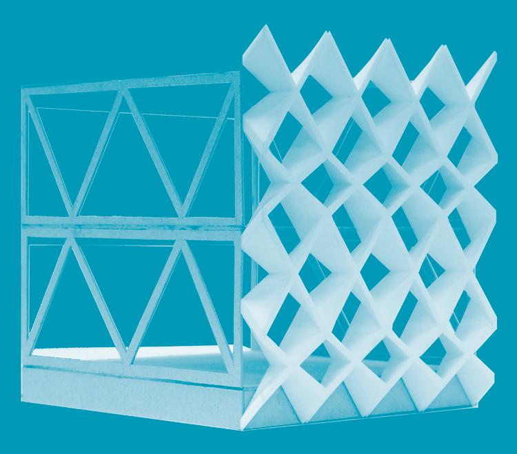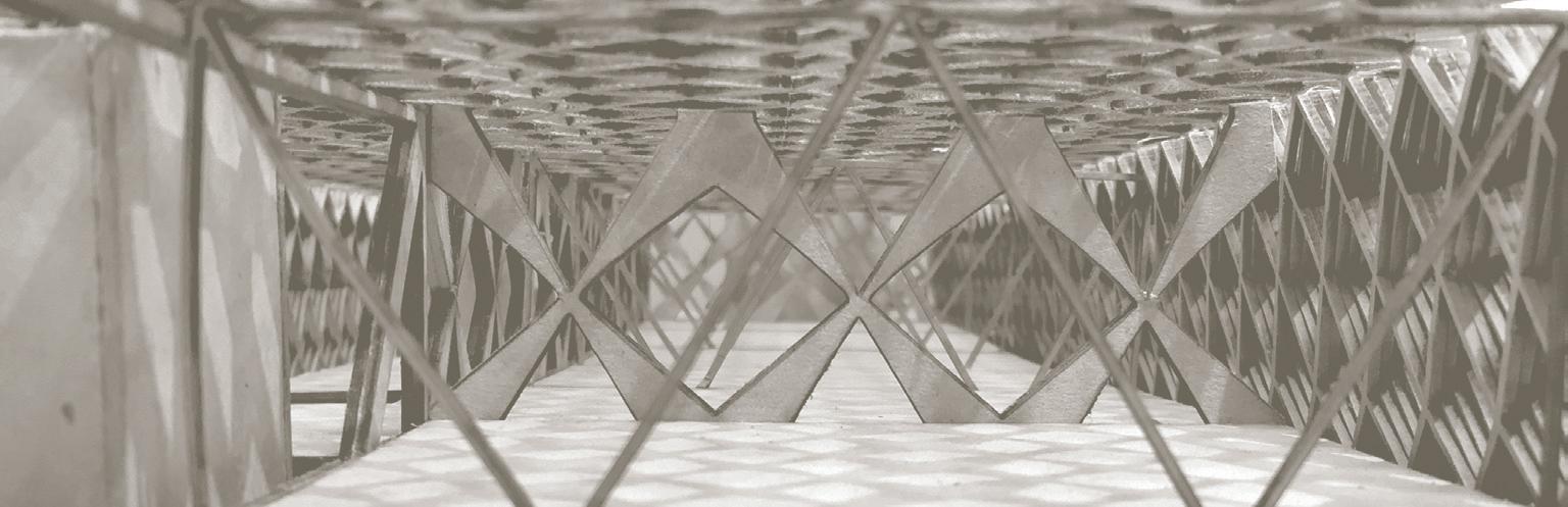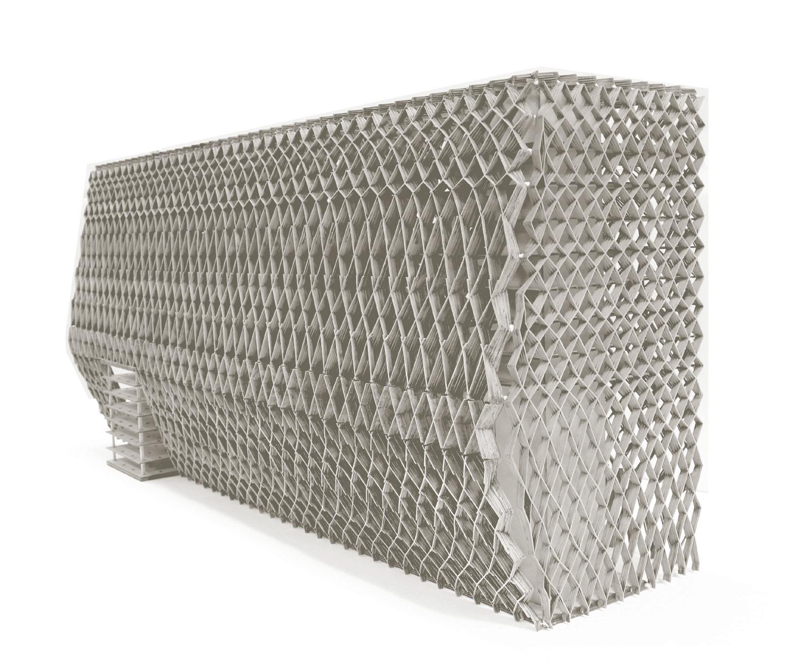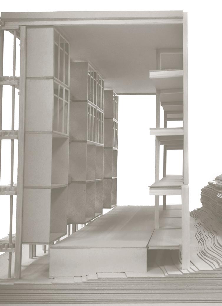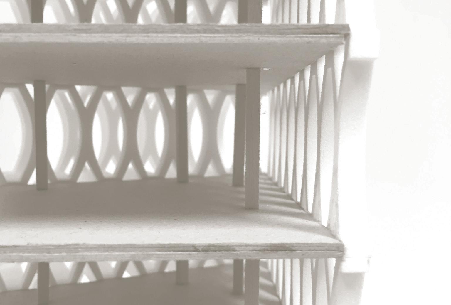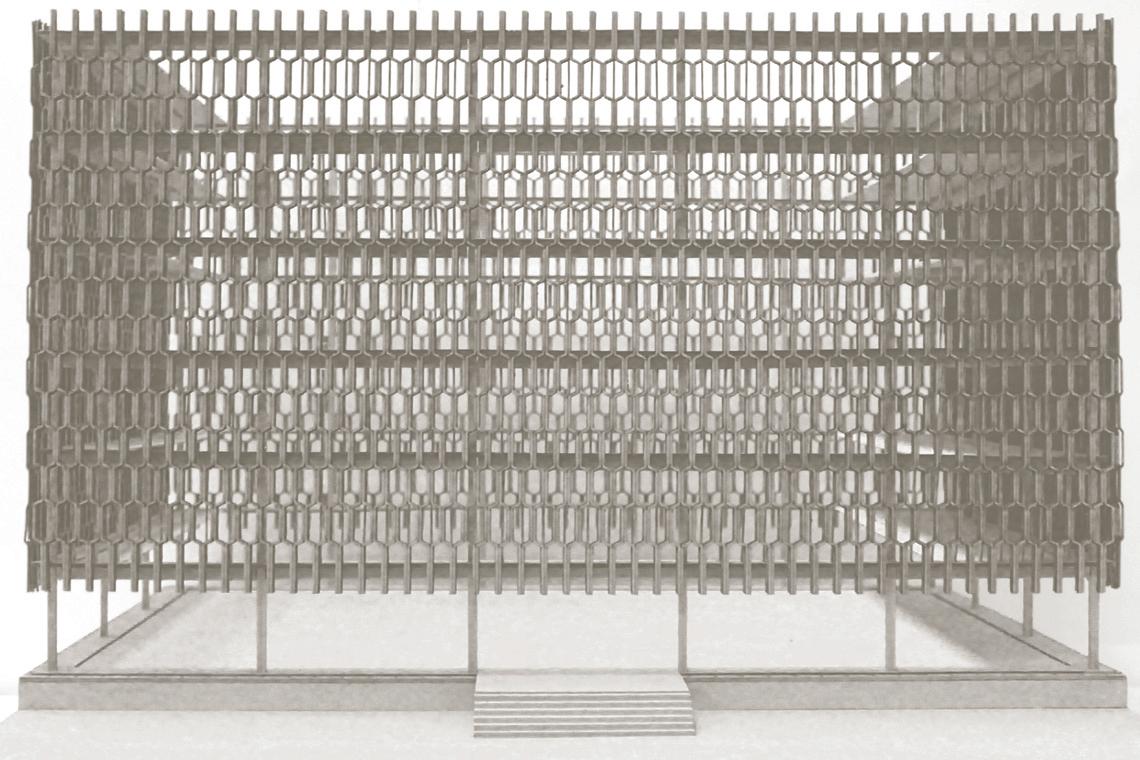 The elevation is composed of three main envelopes: the ‘outer’, the ‘inner’ (Figure 30) and the ‘non-structural’ (Figure 31). The ‘outer’ is made up of alternating rows of light shelves and tables to allow in more diffused light and keep out direct sunlight. The ‘inner’ is composed of triangular folds that act as sunshades, keeping the rain out and directing the view downwards. The ‘non-structural’ envelopes sport a discontinuous vertical element segmented by rows of light shelves. The depth of each envelope is calibrated by their positions on the inside-outside and east-west direction. Different as they may seem, the three elevations read as a unified whole characterized by their vertical elements, proportions and materiality.