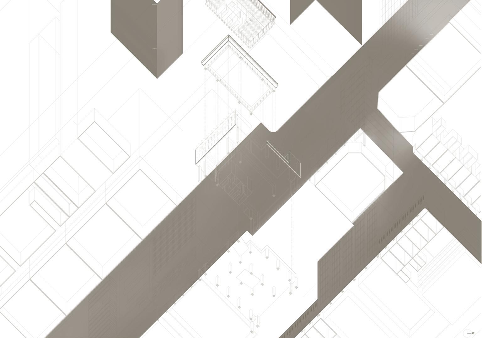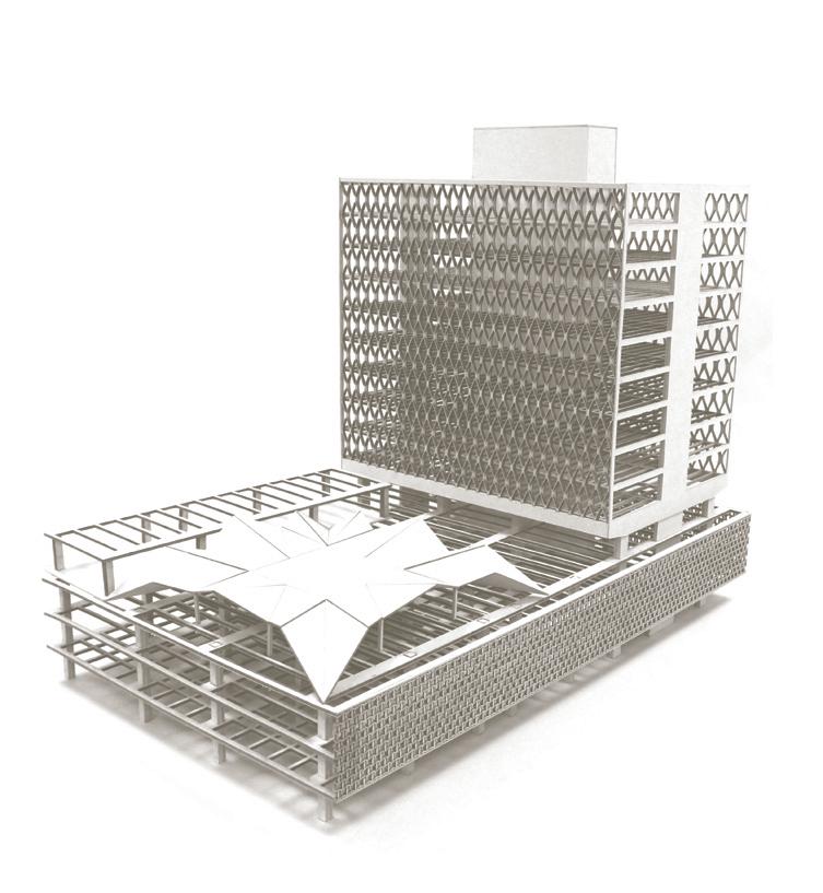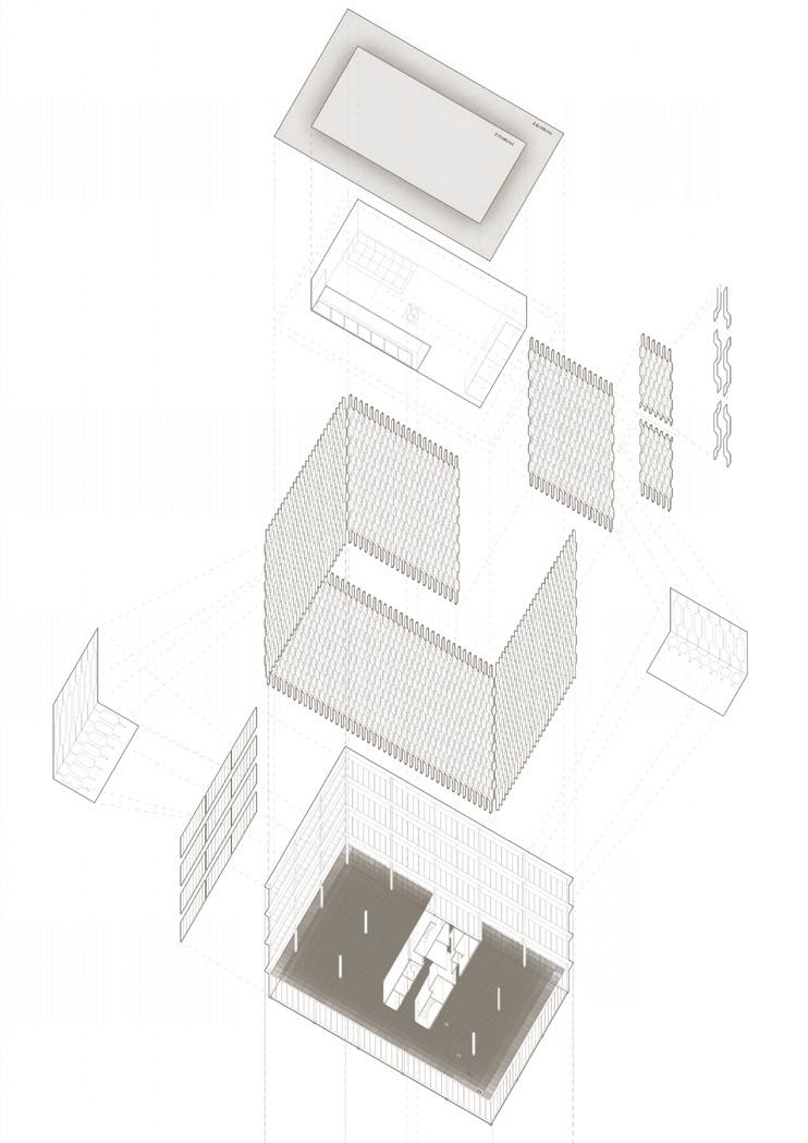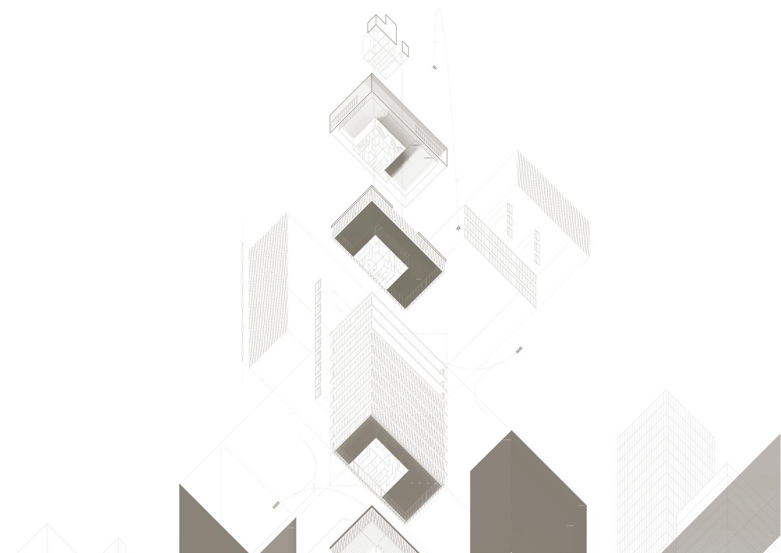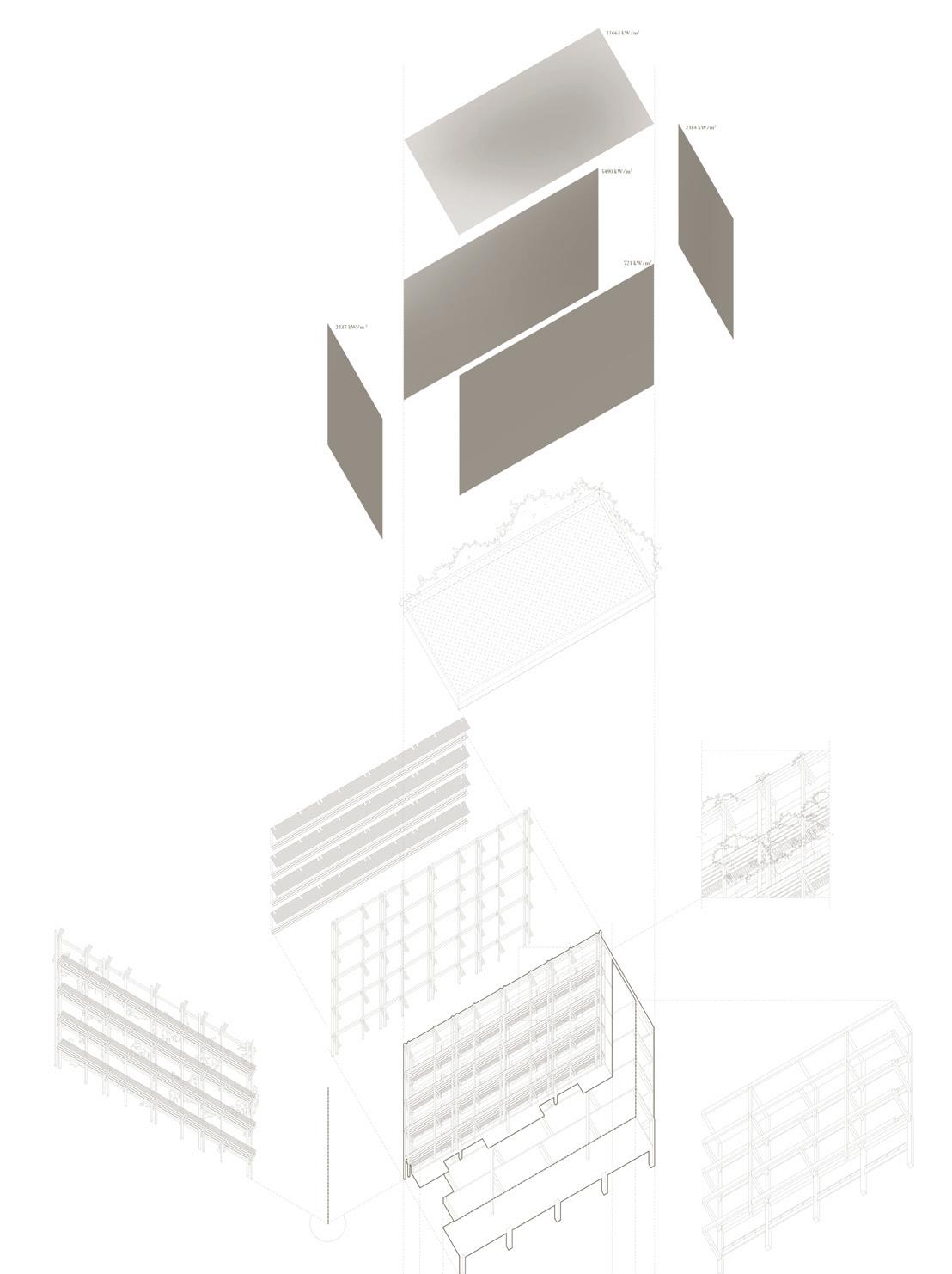 The diagrid structural exterior directs the load to the envelope. The definition of an envelope is usually accompanied with preconceptions such as surface, boundary, shell, skin or façade. In order to push the interpretation of the envelope, firstly, a secondary filigree structure is devised as the envelope for the existing building and the structure for the new addition. Secondly, instead of viewing the envelope as a surface, this endoskeleton reads as a volume within a volume. In order to accentuate the secondary volume, circulation cores are carefully positioned between the outer and inner envelopes. Lastly, the envelope becomes a form of inhabitation. Each twisted pre-cast concrete with built-in joint connects to one another and to the floor beams. The heights of the modules vary to meet the minimum required headroom. The three-dimensional Y columns support the folded canopy and set up the grid for the parking lots in the basement. Similarly, the partitions of the new levels are organised according to the structural span between the trusses.