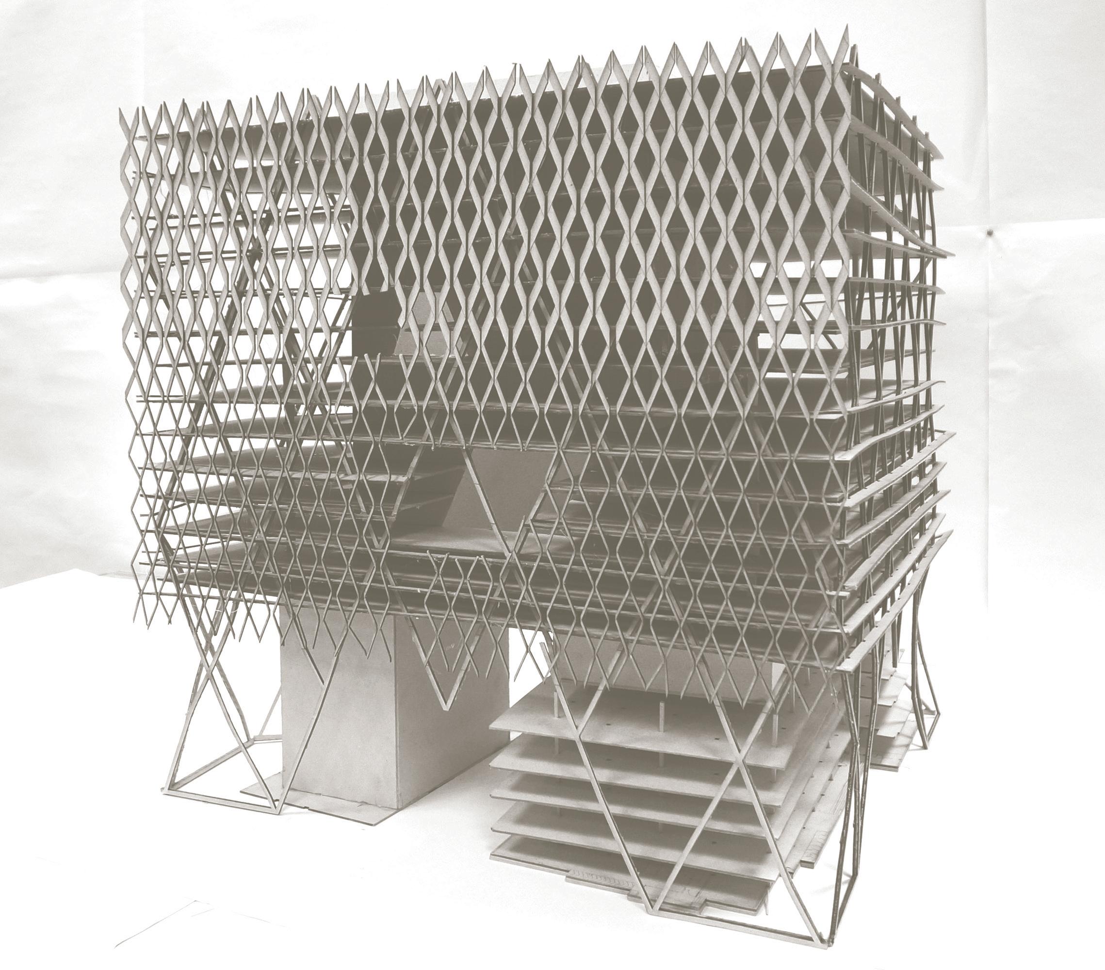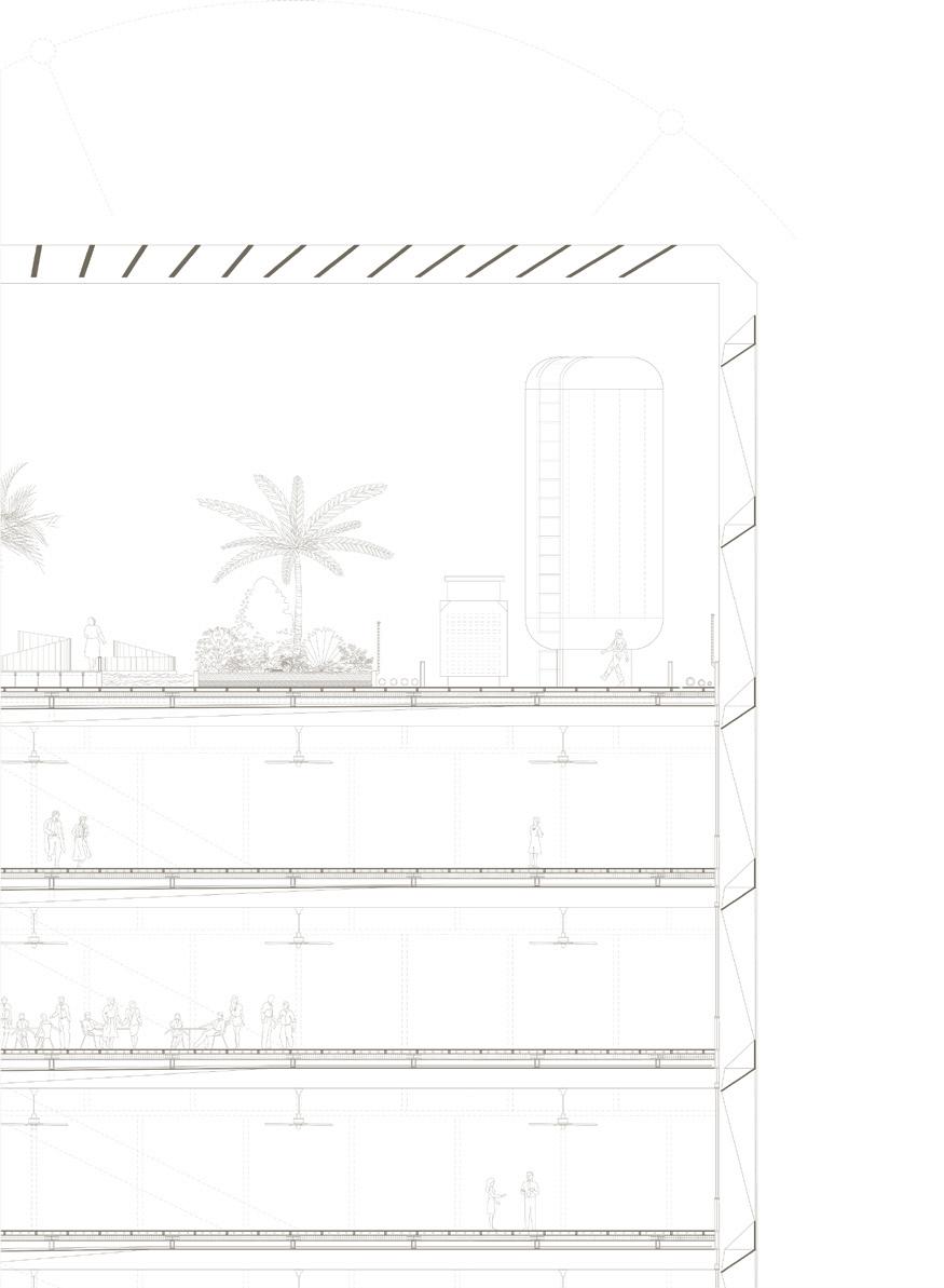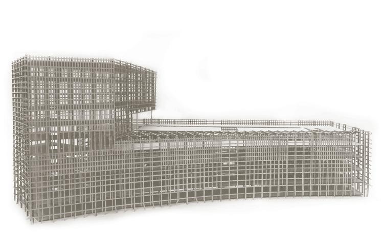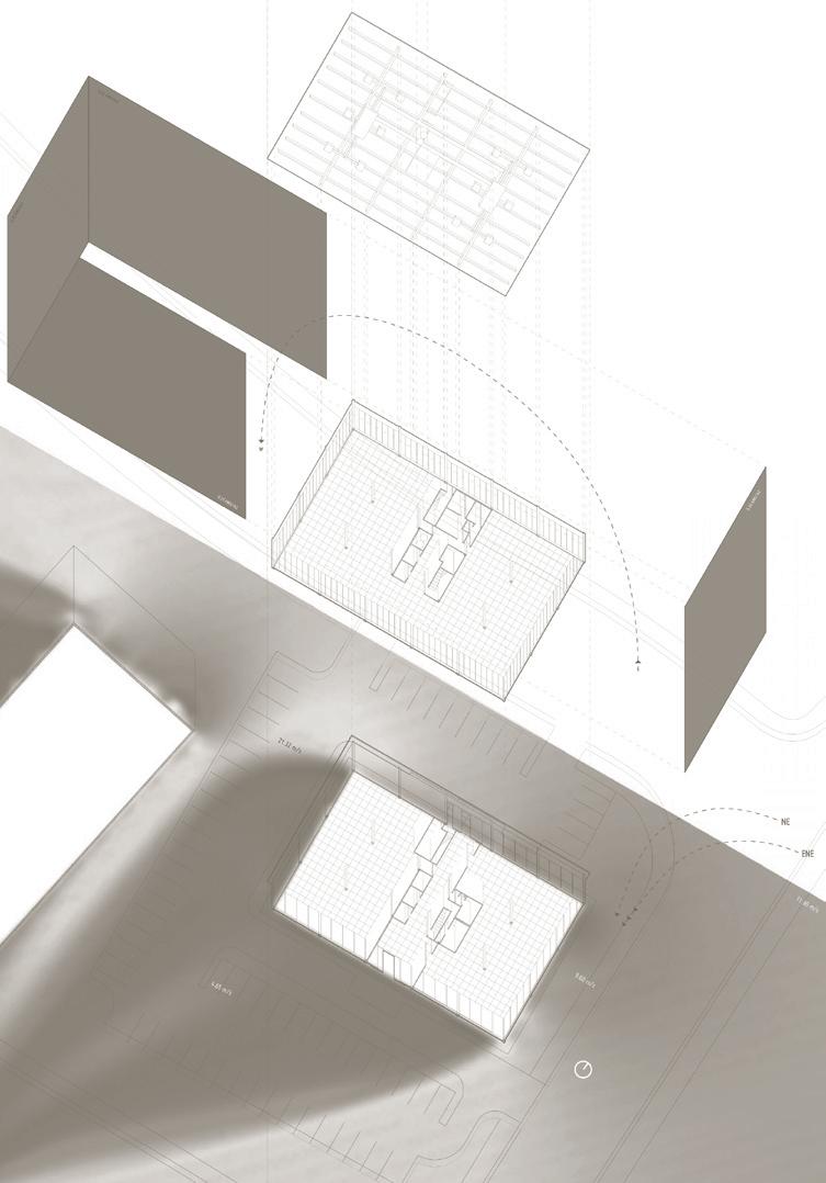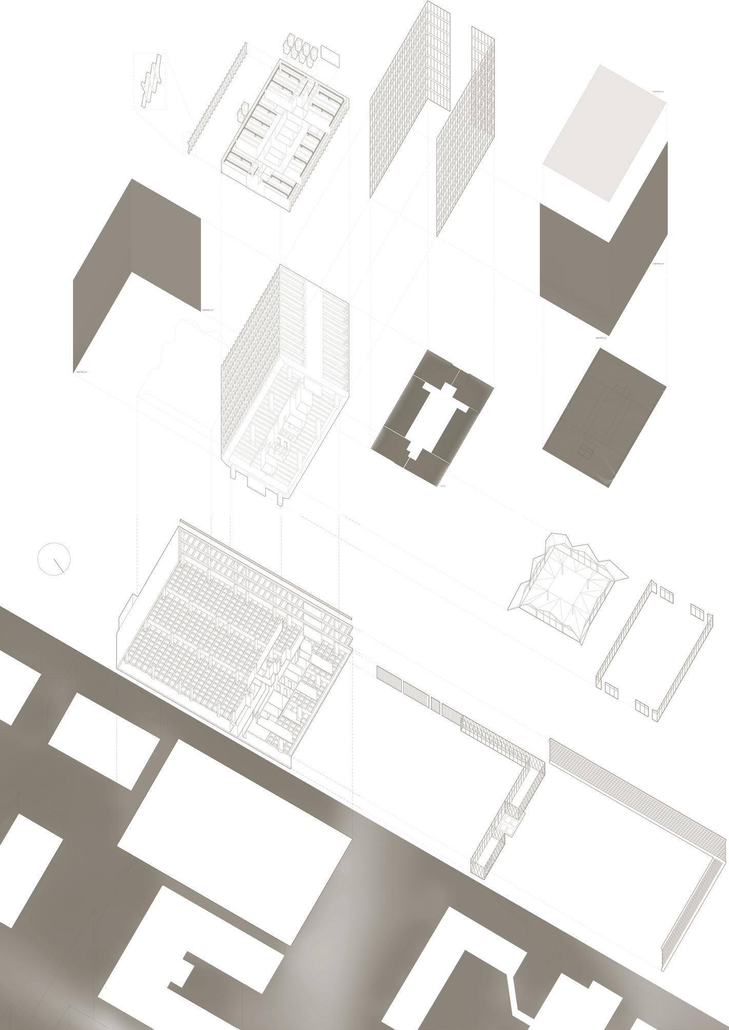 The diagrid structural exterior directs the load to the envelope. The definition of an envelope is usually accompanied with preconceptions such as surface, boundary, shell, skin or façade. In order to push the interpretation of the envelope, firstly, a secondary filigree structure is devised as the envelope for the existing building and the structure for the new addition. Secondly, instead of viewing the envelope as a surface, this endoskeleton reads as a volume within a volume. In order to accentuate the secondary volume, circulation cores are carefully positioned between the outer and inner envelopes. Lastly, the envelope becomes a form of inhabitation. Each twisted pre-cast concrete with built-in joint connects to one another and to the floor beams. The heights of the modules vary to meet the minimum required headroom. The three-dimensional Y columns support the folded canopy and set up the grid for the parking lots in the basement. Similarly, the partitions of the new levels are organised according to the structural span between the trusses.