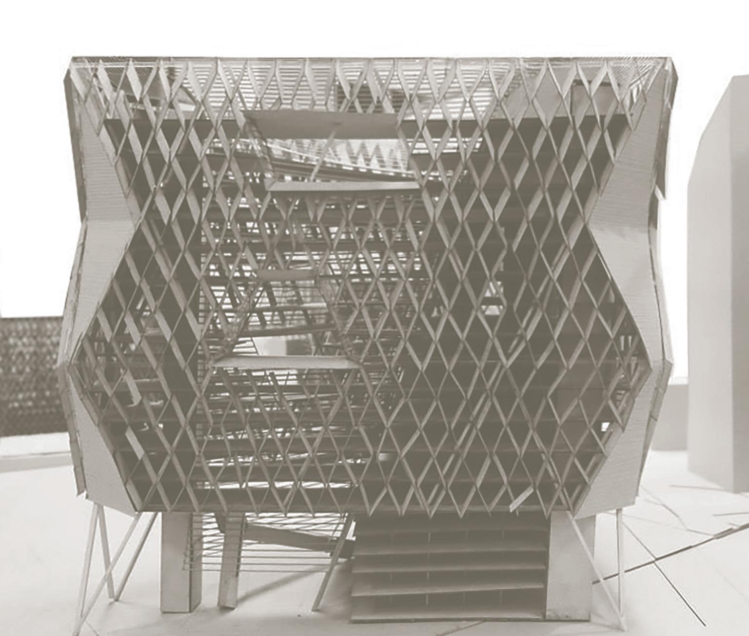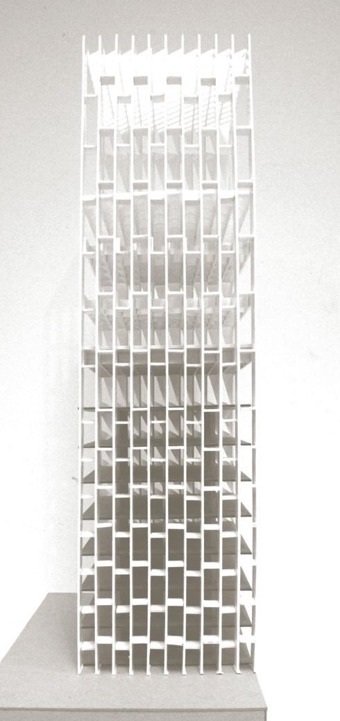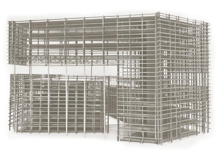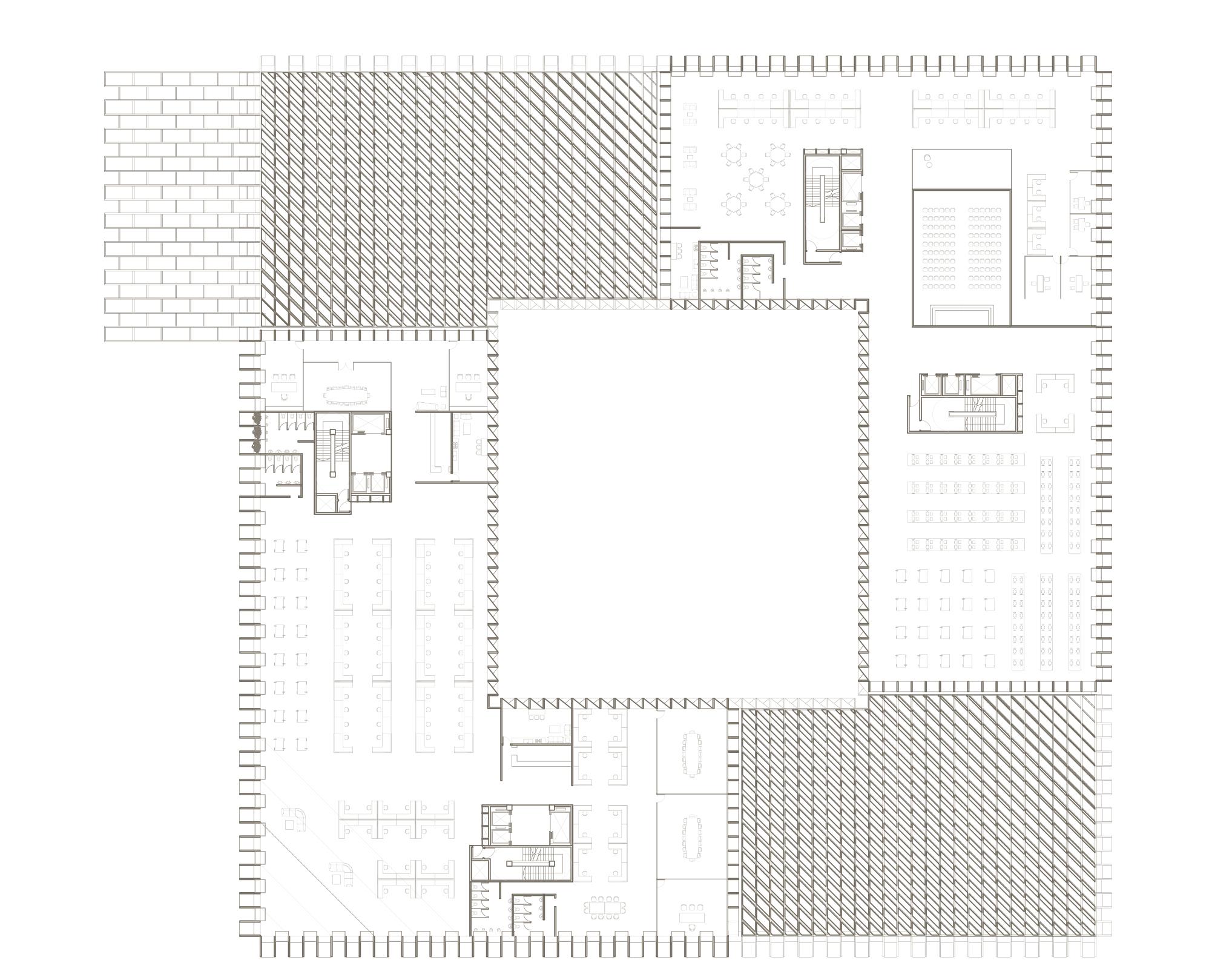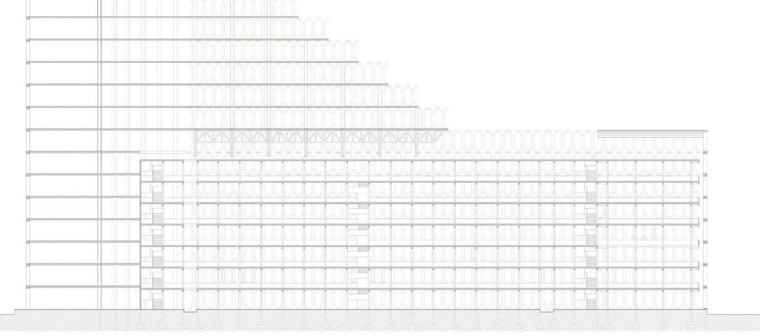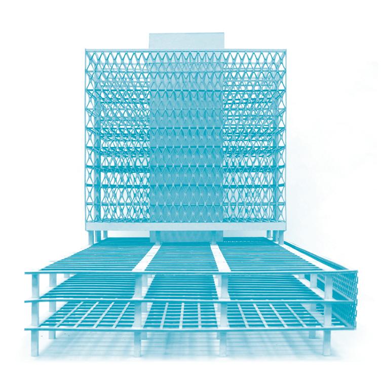 The diagrid structural exterior directs the load to the envelope. The definition of an envelope is usually accompanied with preconceptions such as surface, boundary, shell, skin or façade. In order to push the interpretation of the envelope, firstly, a secondary filigree structure is devised as the envelope for the existing building and the structure for the new addition. Secondly, instead of viewing the envelope as a surface, this endoskeleton reads as a volume within a volume. In order to accentuate the secondary volume, circulation cores are carefully positioned between the outer and inner envelopes. Lastly, the envelope becomes a form of inhabitation. Each twisted pre-cast concrete with built-in joint connects to one another and to the floor beams. The heights of the modules vary to meet the minimum required headroom. The three-dimensional Y columns support the folded canopy and set up the grid for the parking lots in the basement. Similarly, the partitions of the new levels are organised according to the structural span between the trusses.